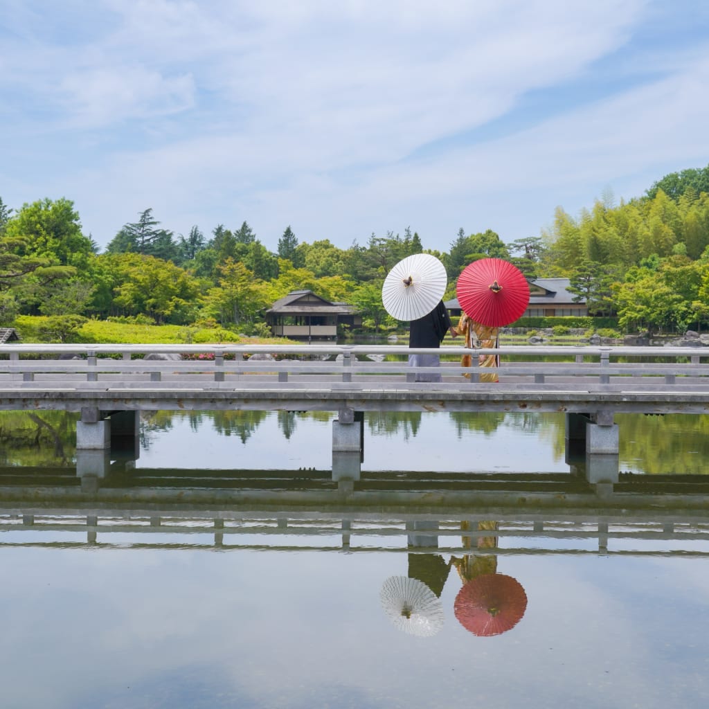 季節の花、池、橋などなどたくさんのバリエーションで撮影できるスポットです。2箇所プランで花畑と日本庭園での撮影が人気です。