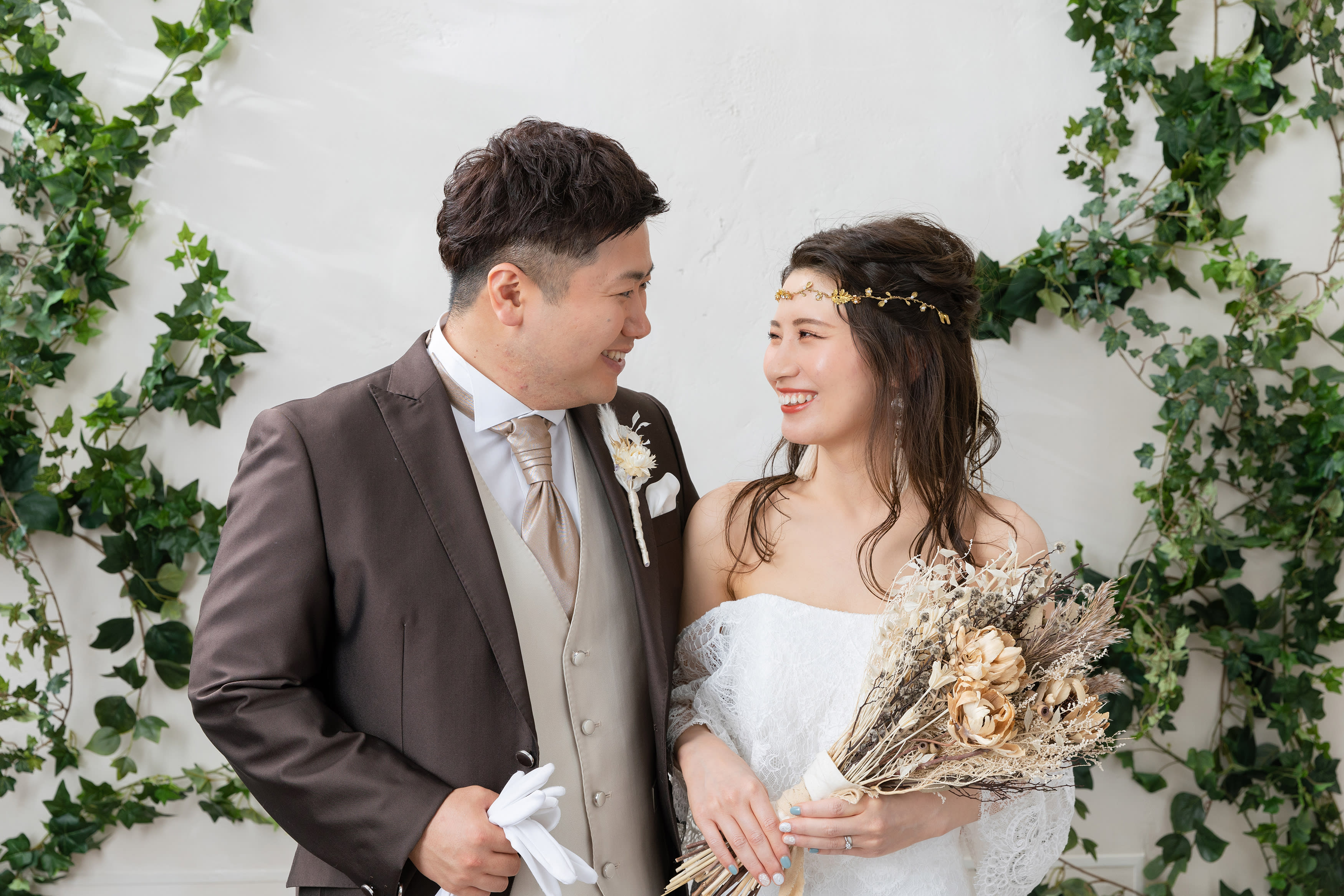 花壁で新郎様にバックハグをしていただきました!お二人の笑顔とても素敵です!