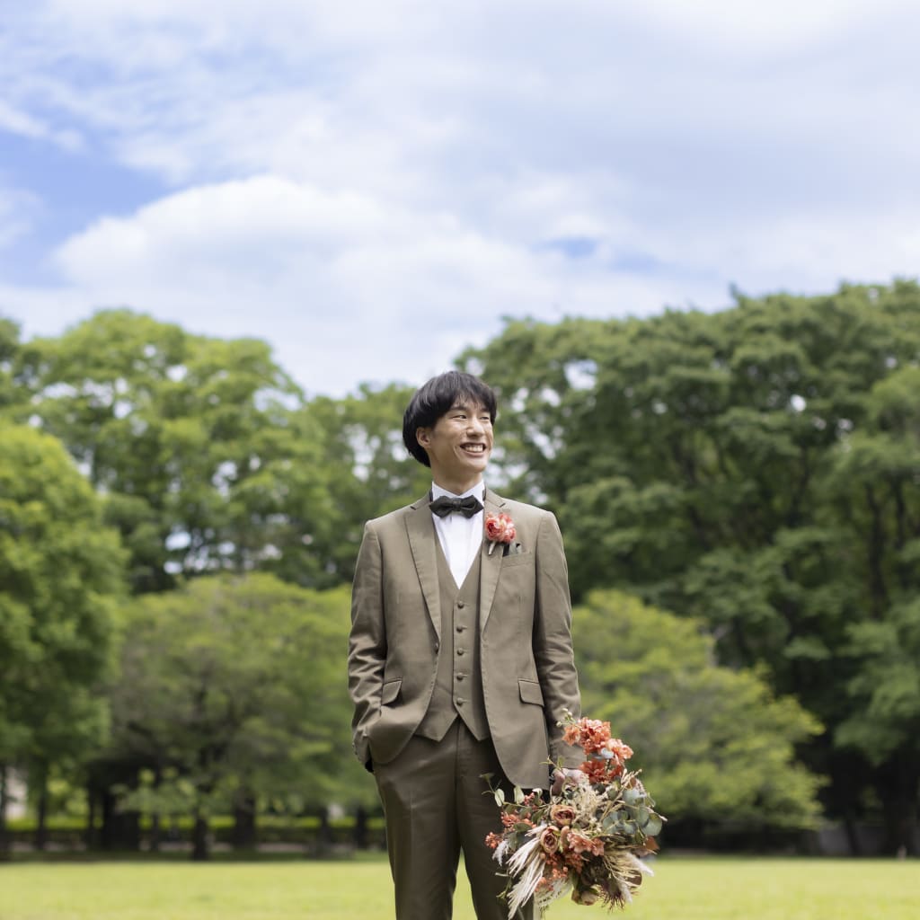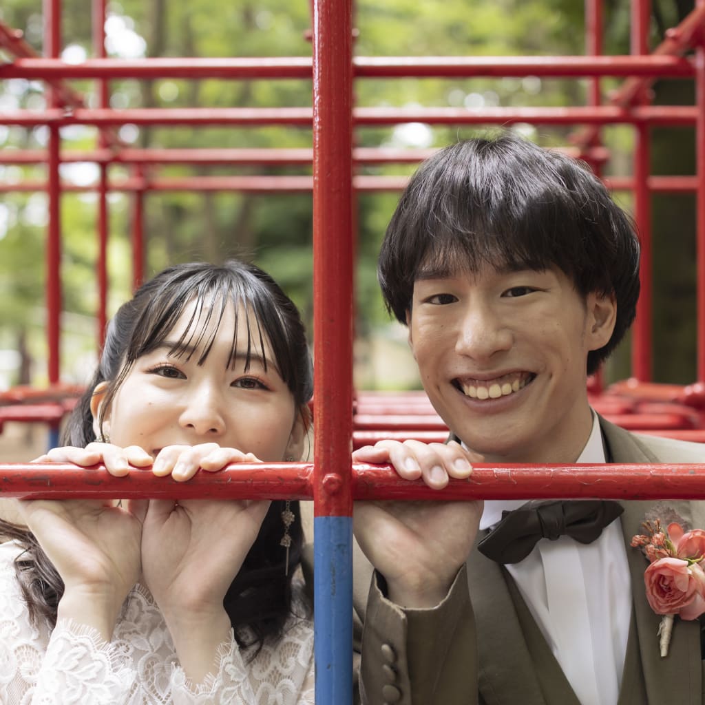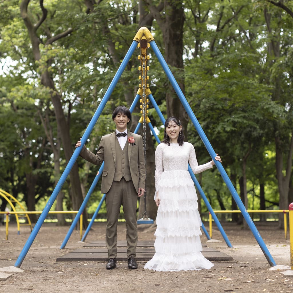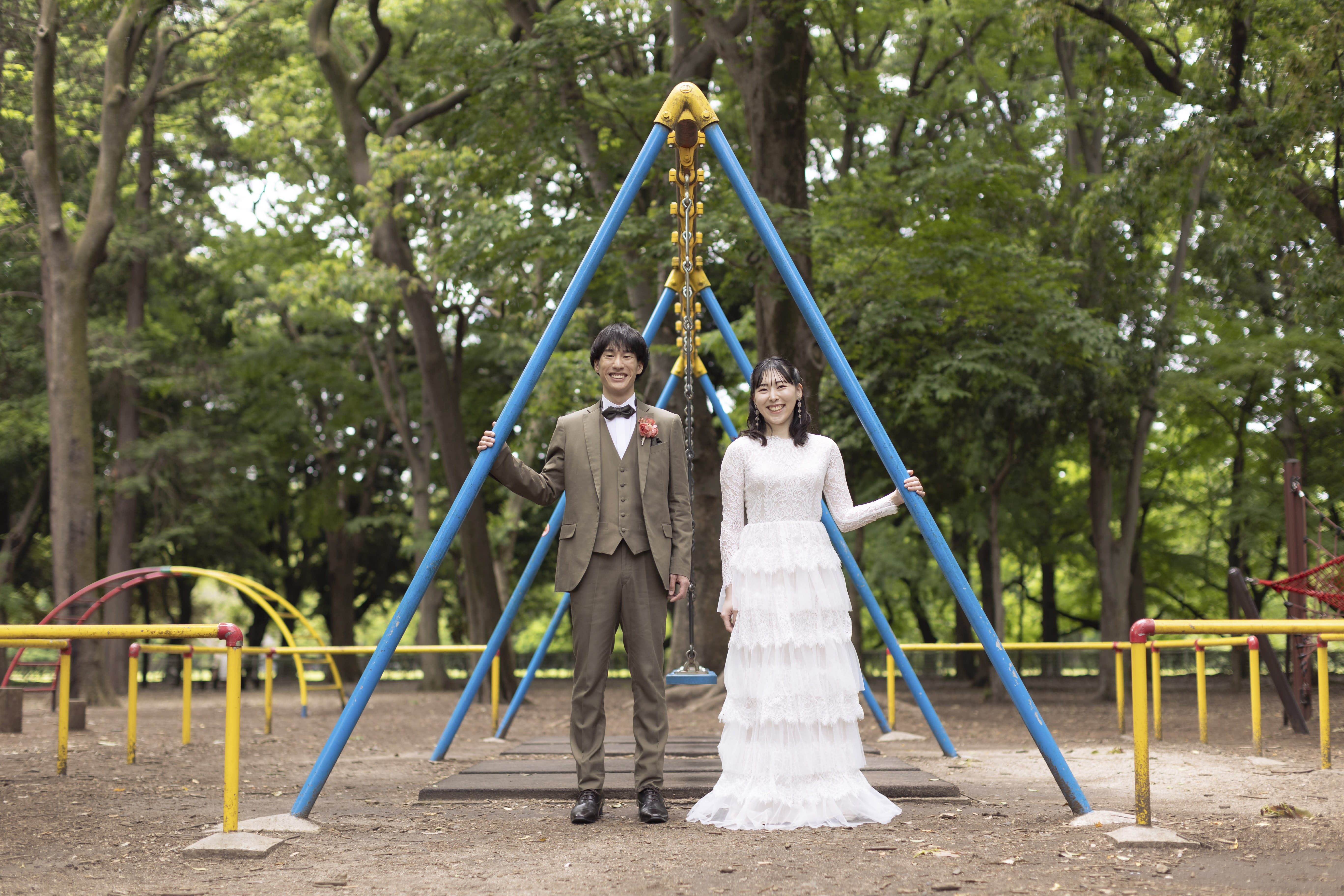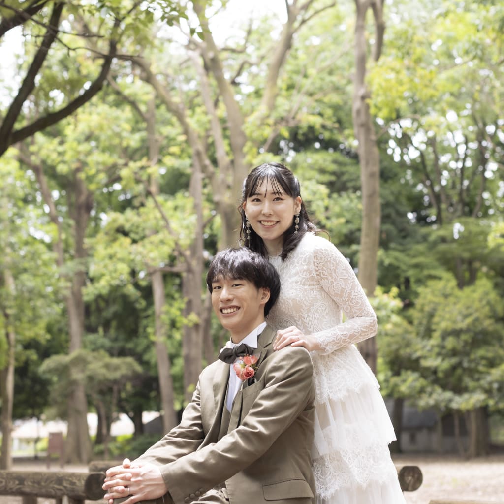 都心から少しはなれた、落ち着いた公園でリラックスしたウェディングフォトを