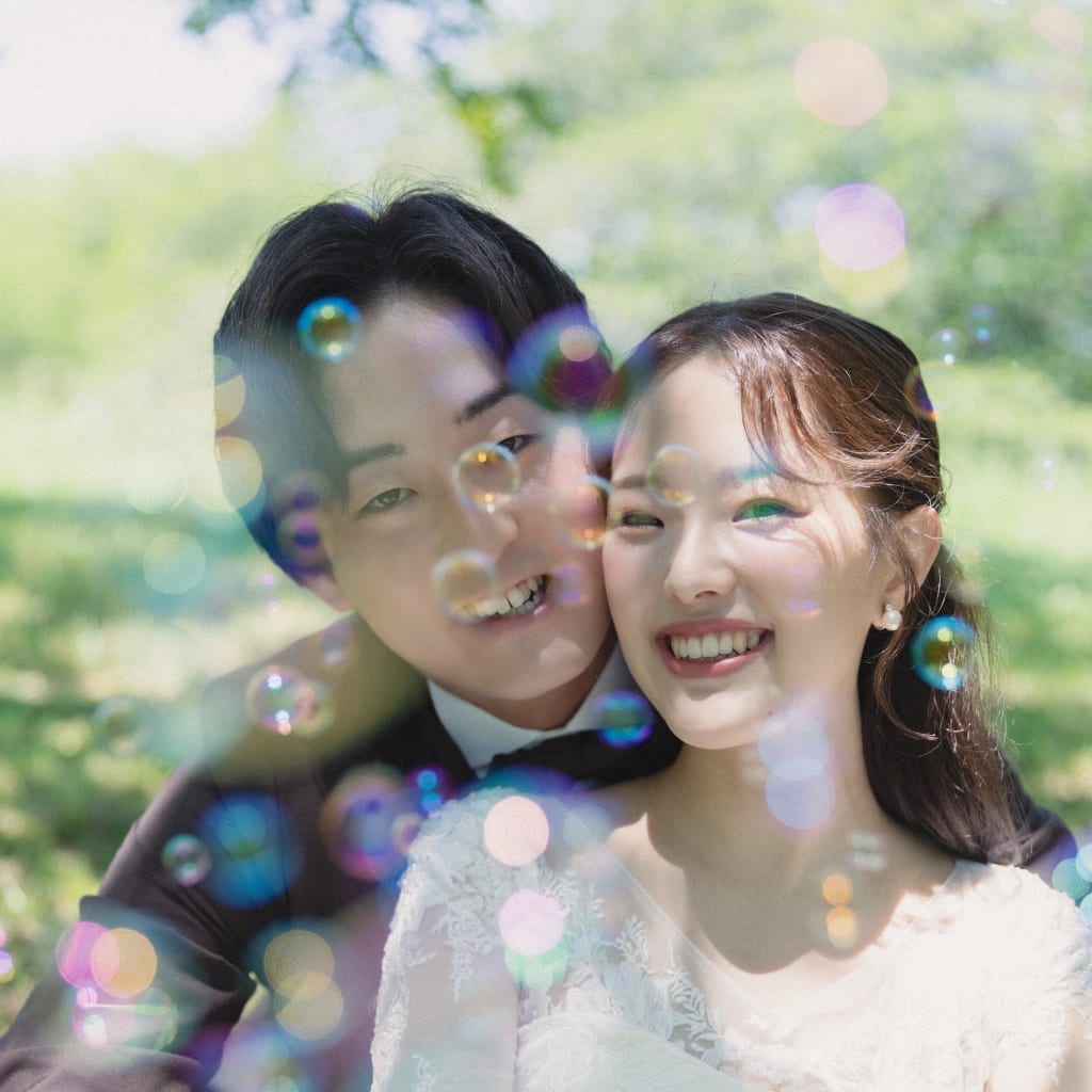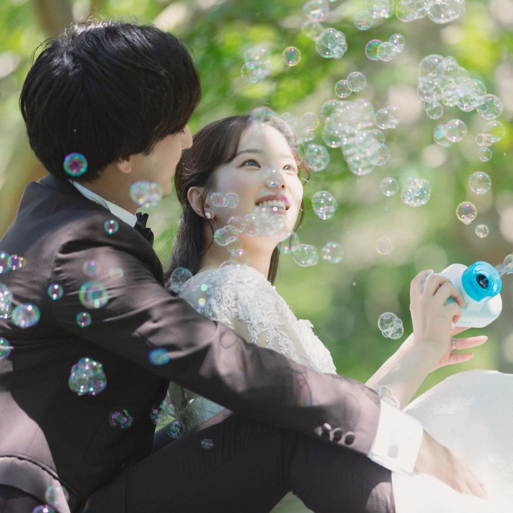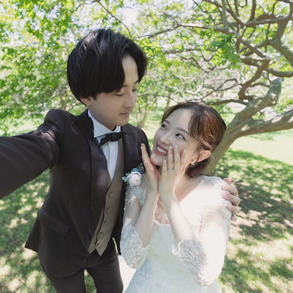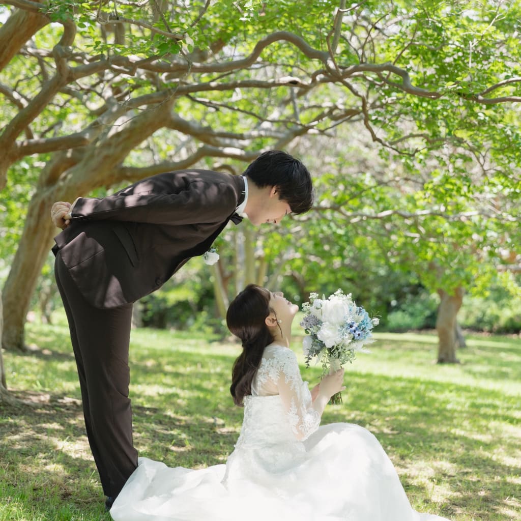 最後は、ブーケを使って顔隠しショット♫ 青空と青色のブーケ♡