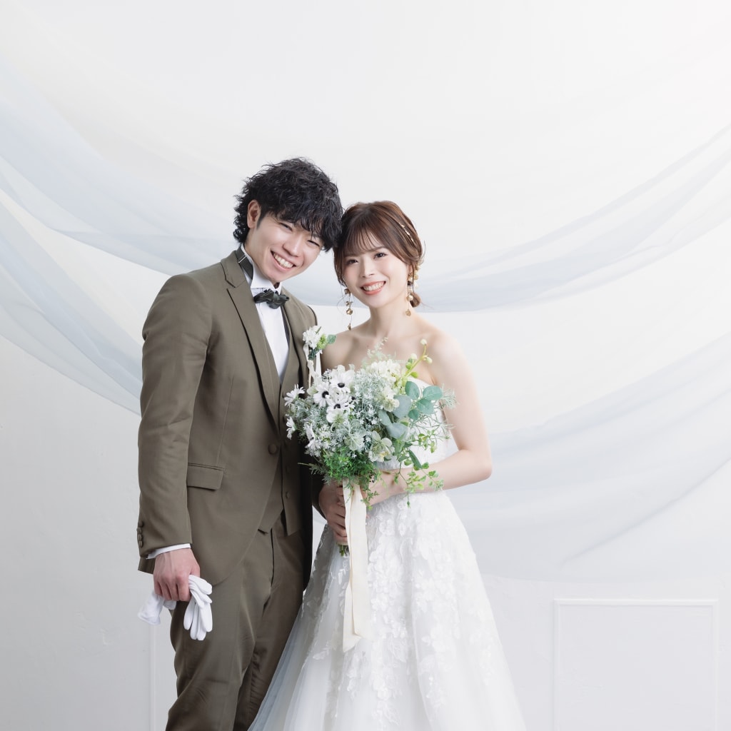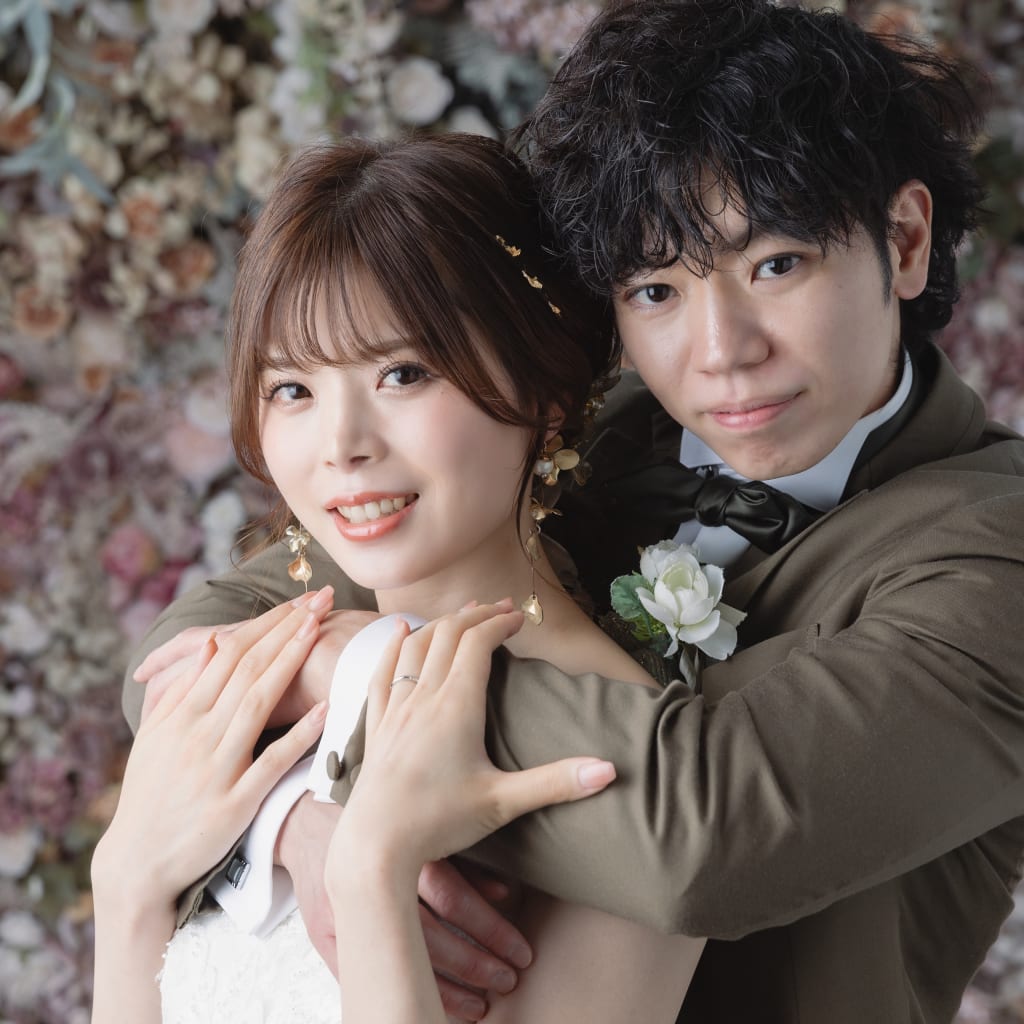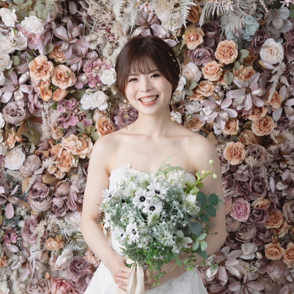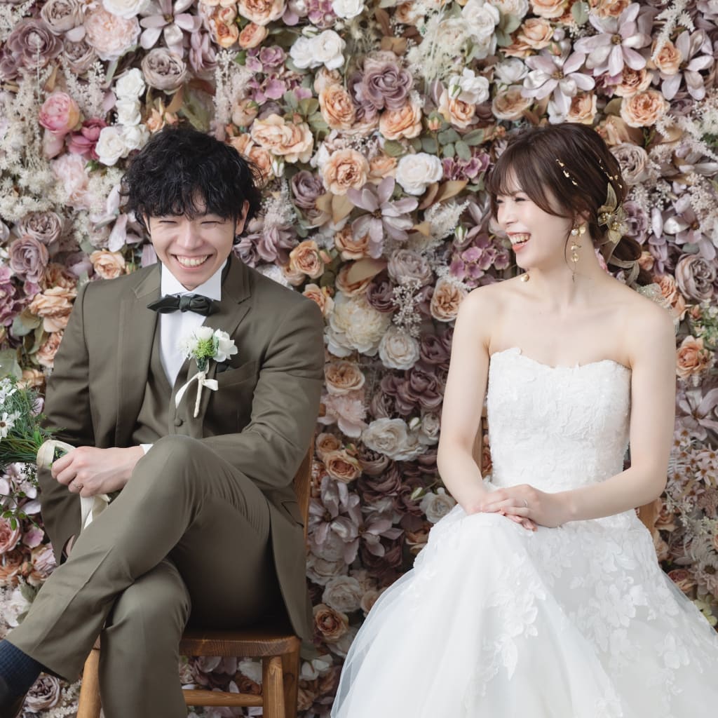 本日は洋装ハウススタジオでの撮影のご紹介♫ まずは、フラワーウォールの前で結婚しましたのショット!