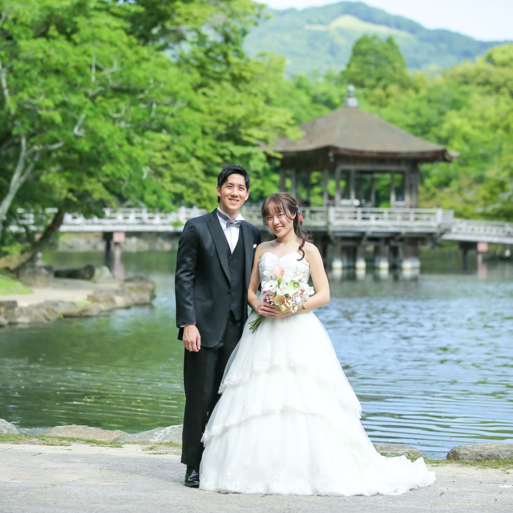 大阪から奈良への小旅行。奈良公園や浮見堂でのフォトウェディング。お二人の幸せそうな笑顔で素敵な結婚写真に仕上がりました。
