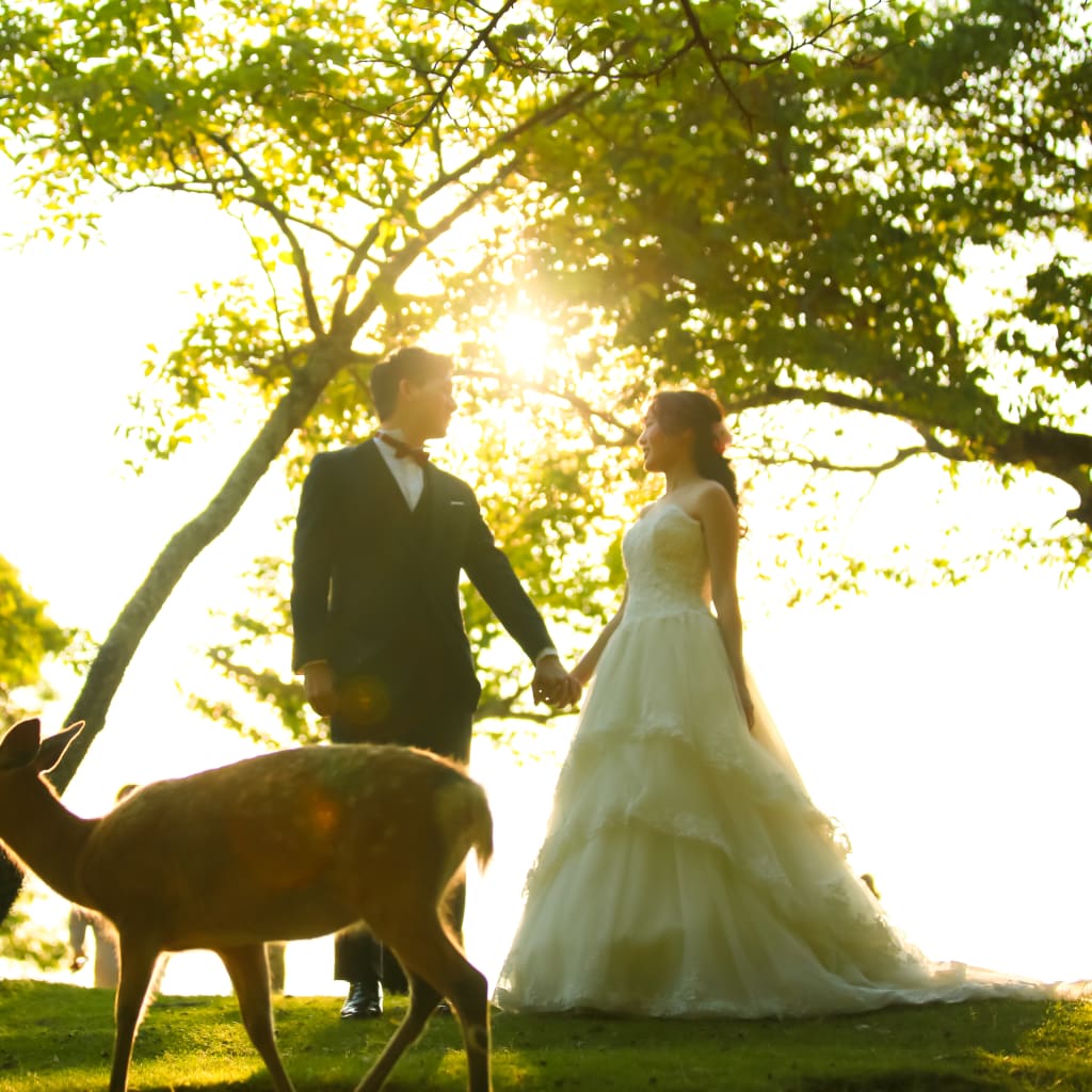 新緑の木漏れ日のきれいな奈良公園でフォトウェディング。