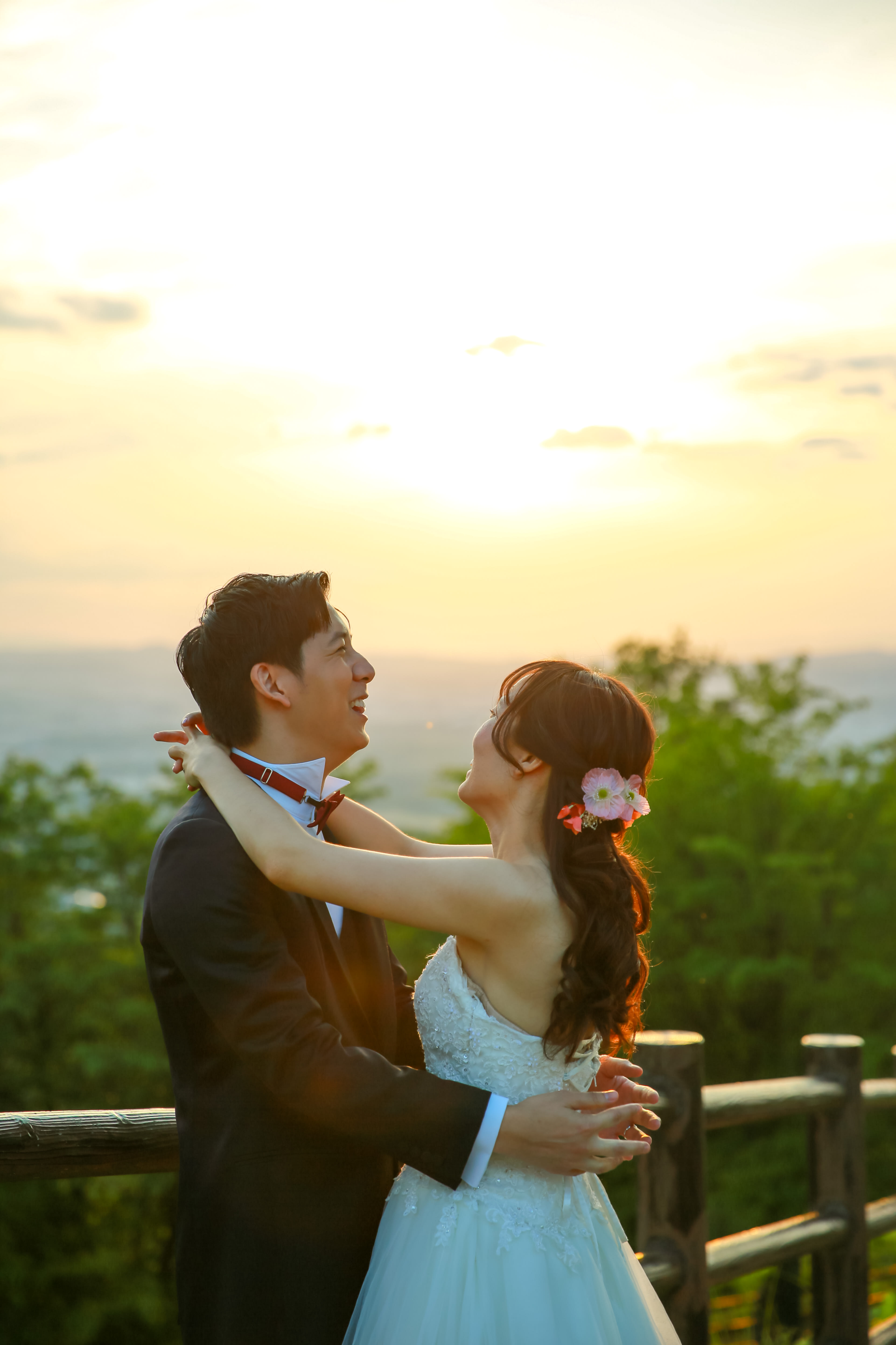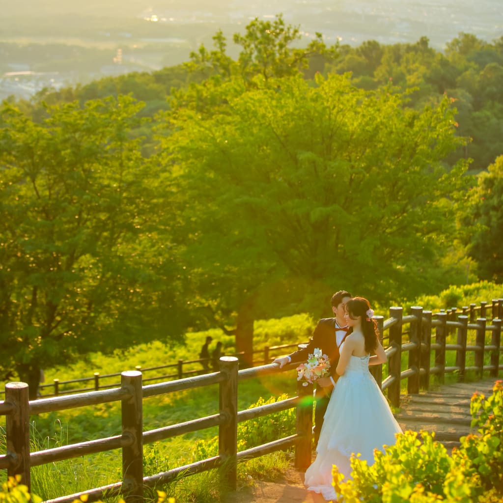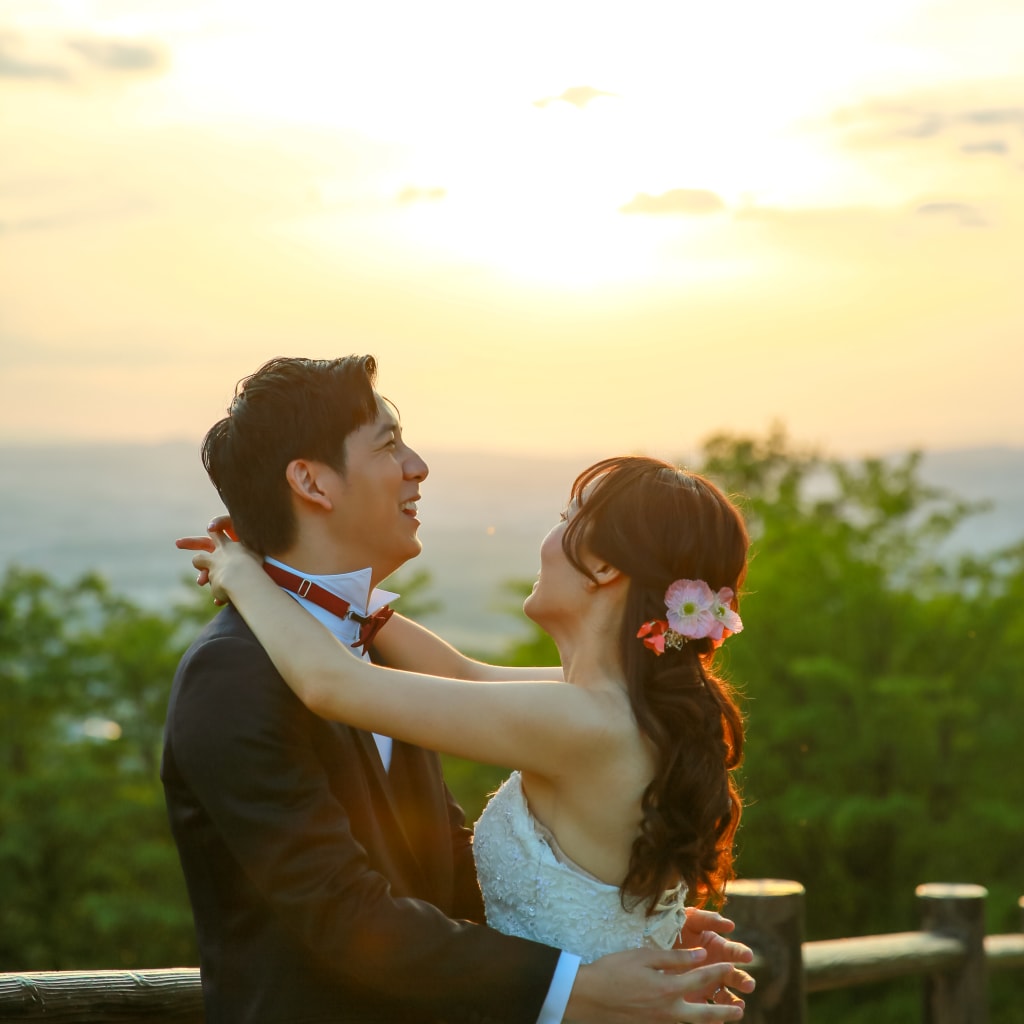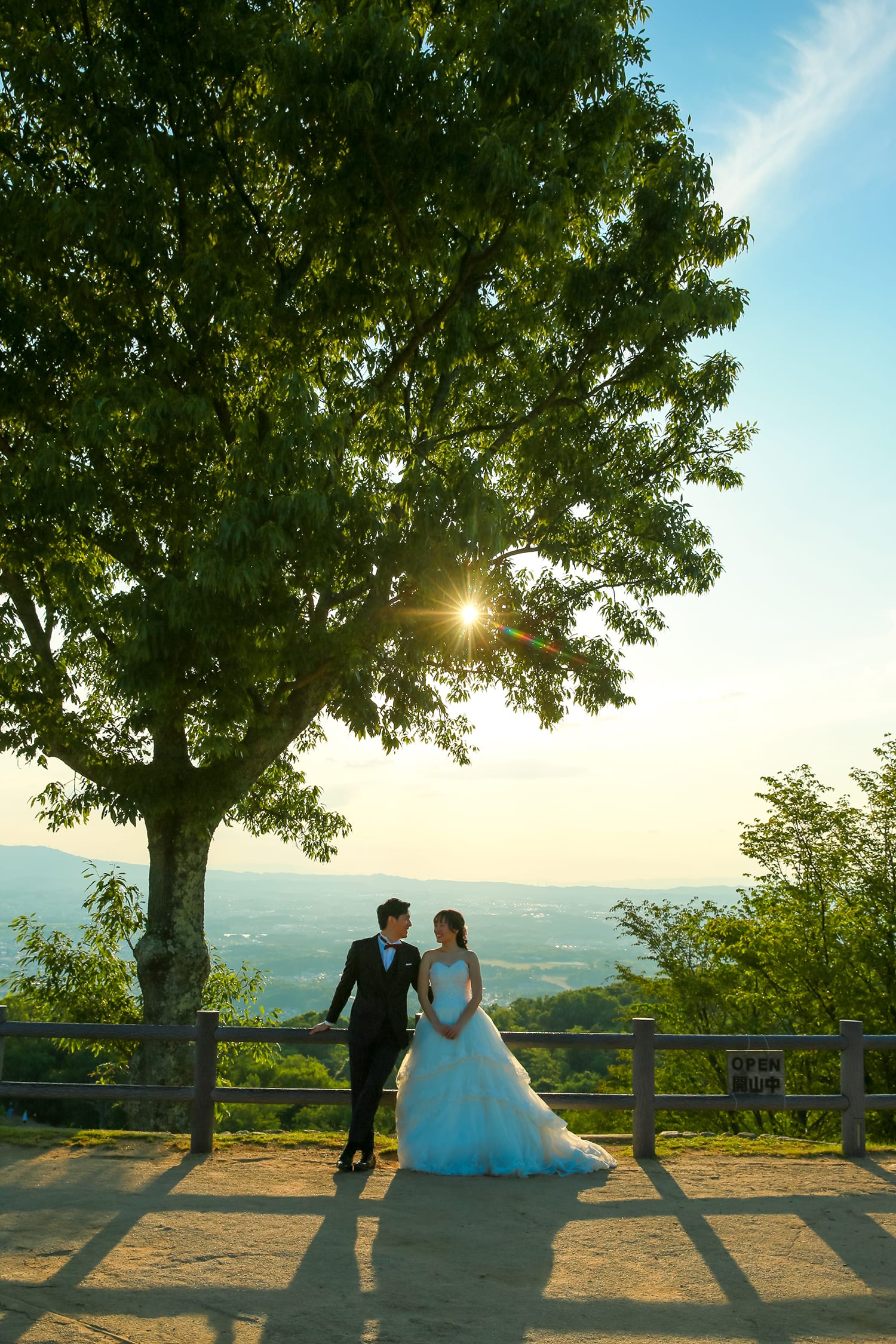 大阪からすぐ!奈良若草山から眺めるきれいな青空のもと、お二人の楽しそうなフォトウェディング。