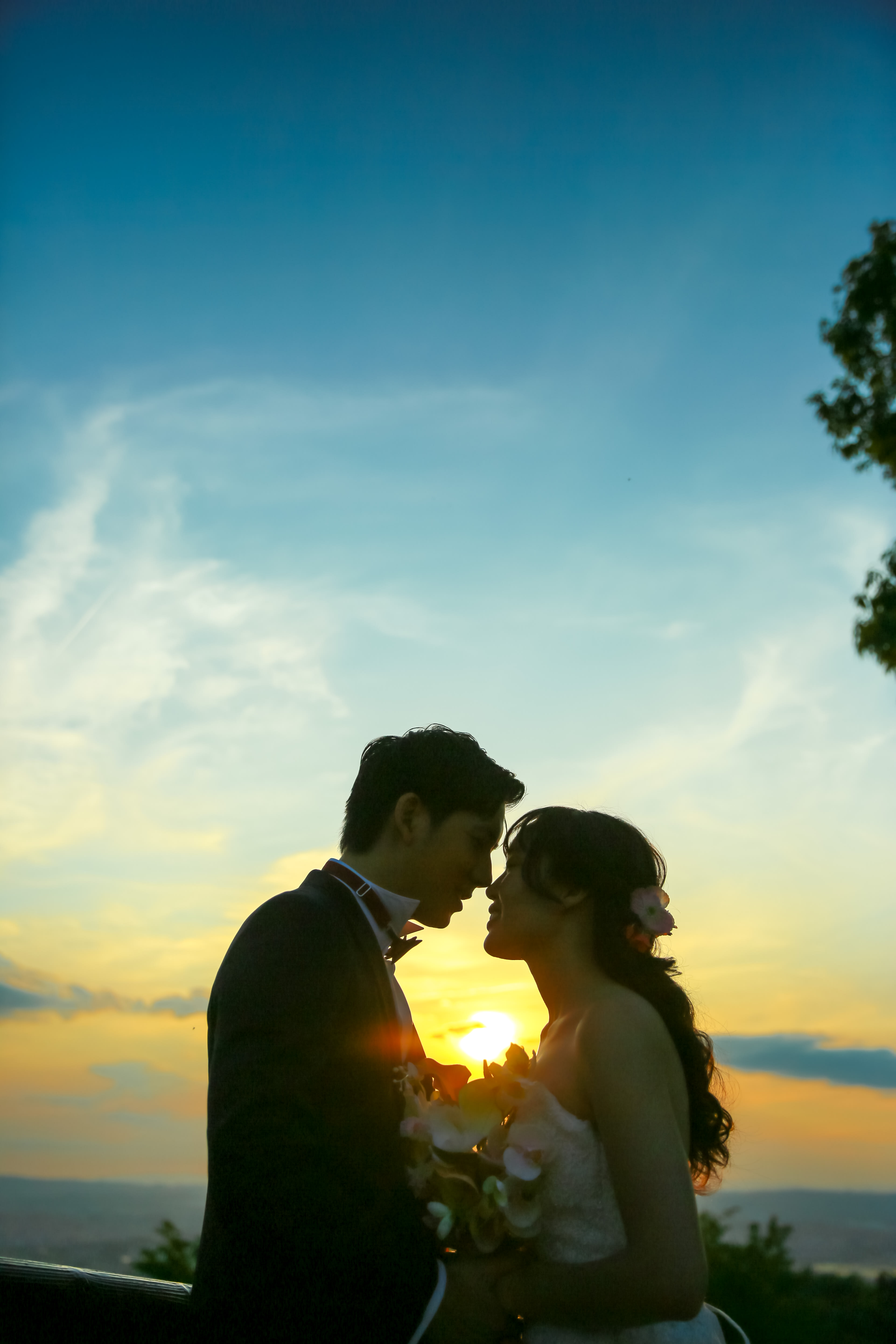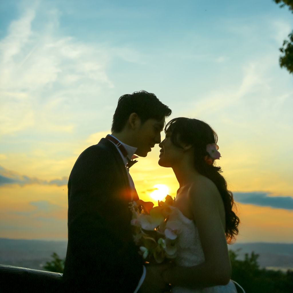 夕日がお二人を照らすウェディングフォト。かっこいい一枚に仕上がりました。