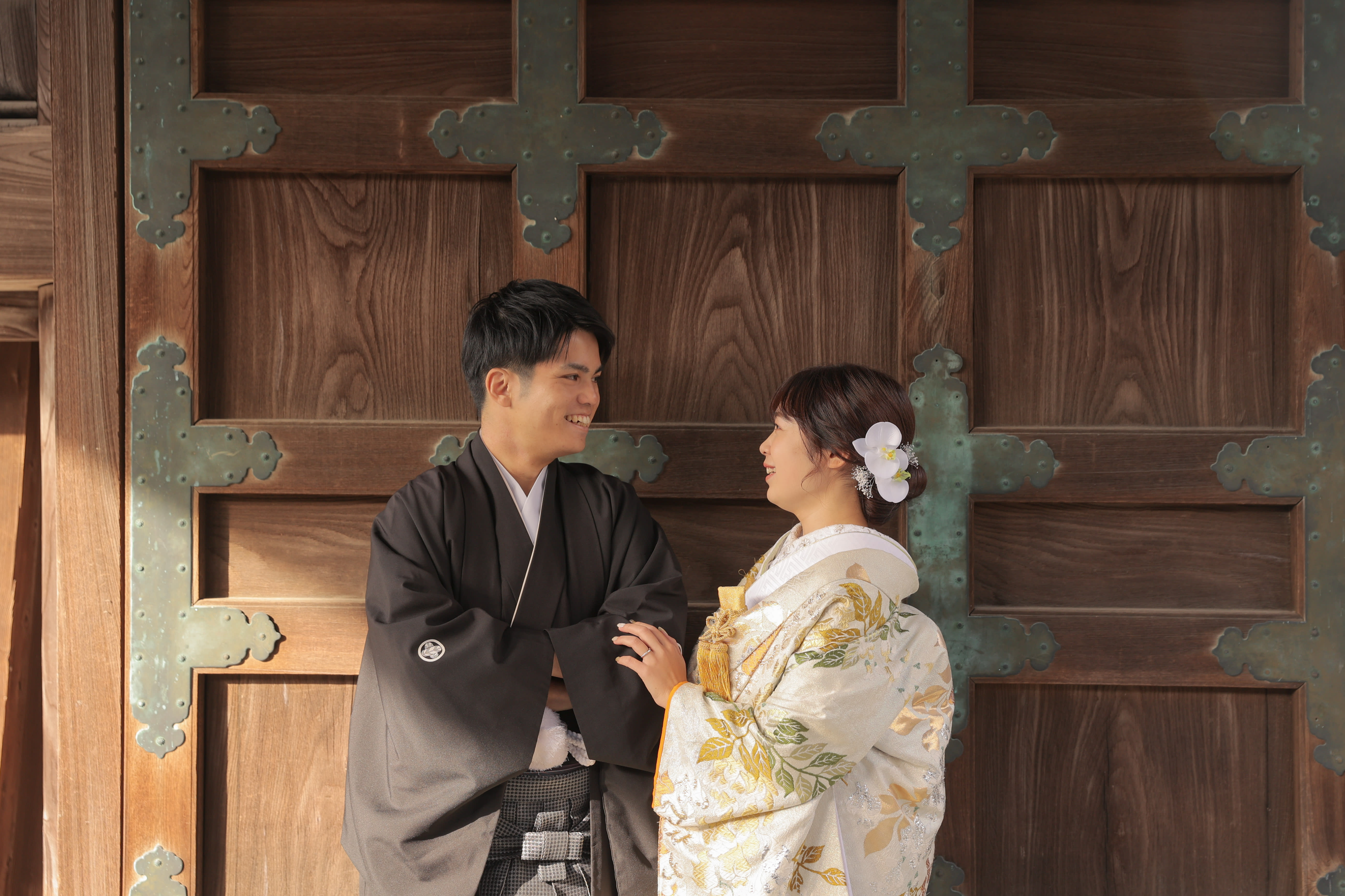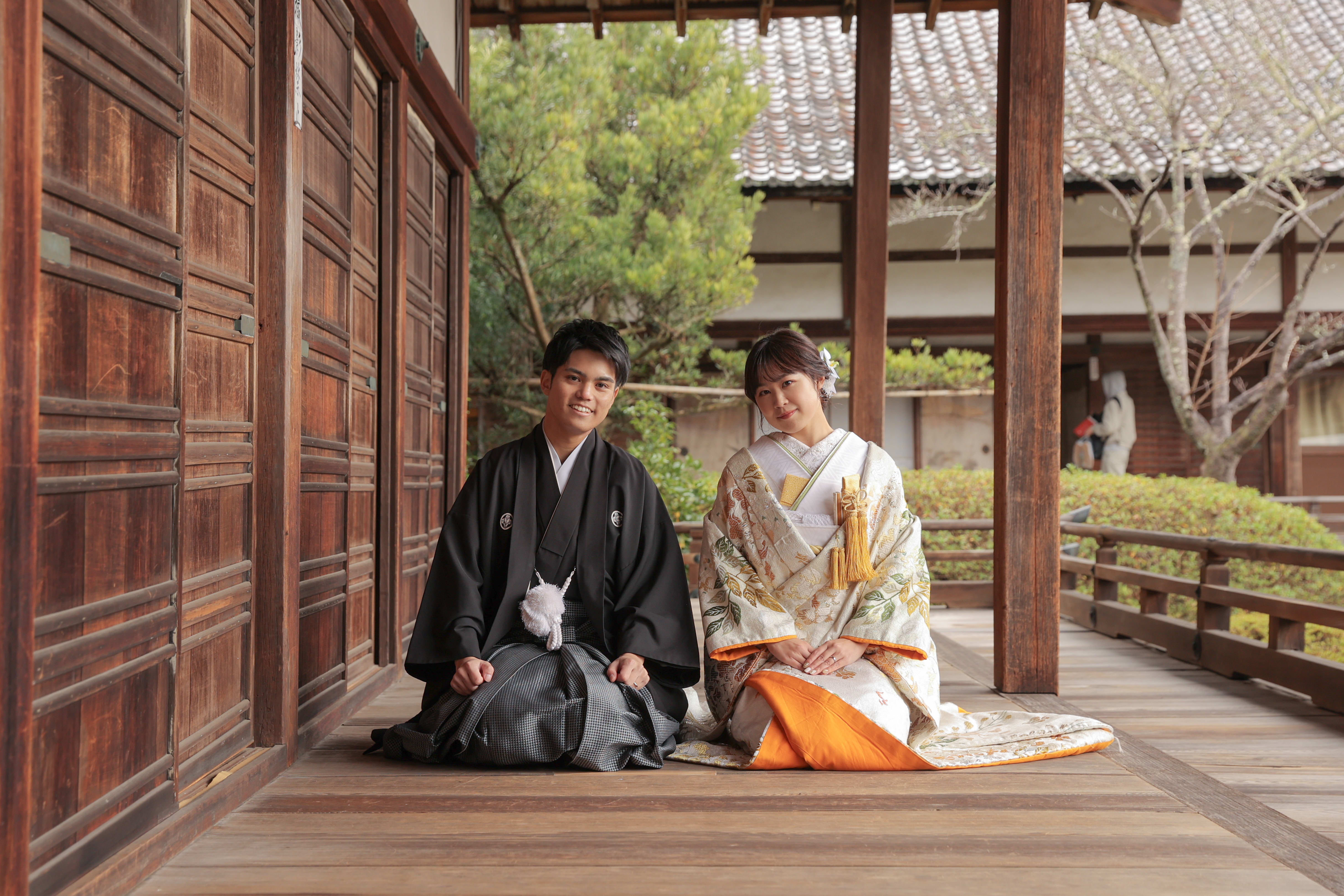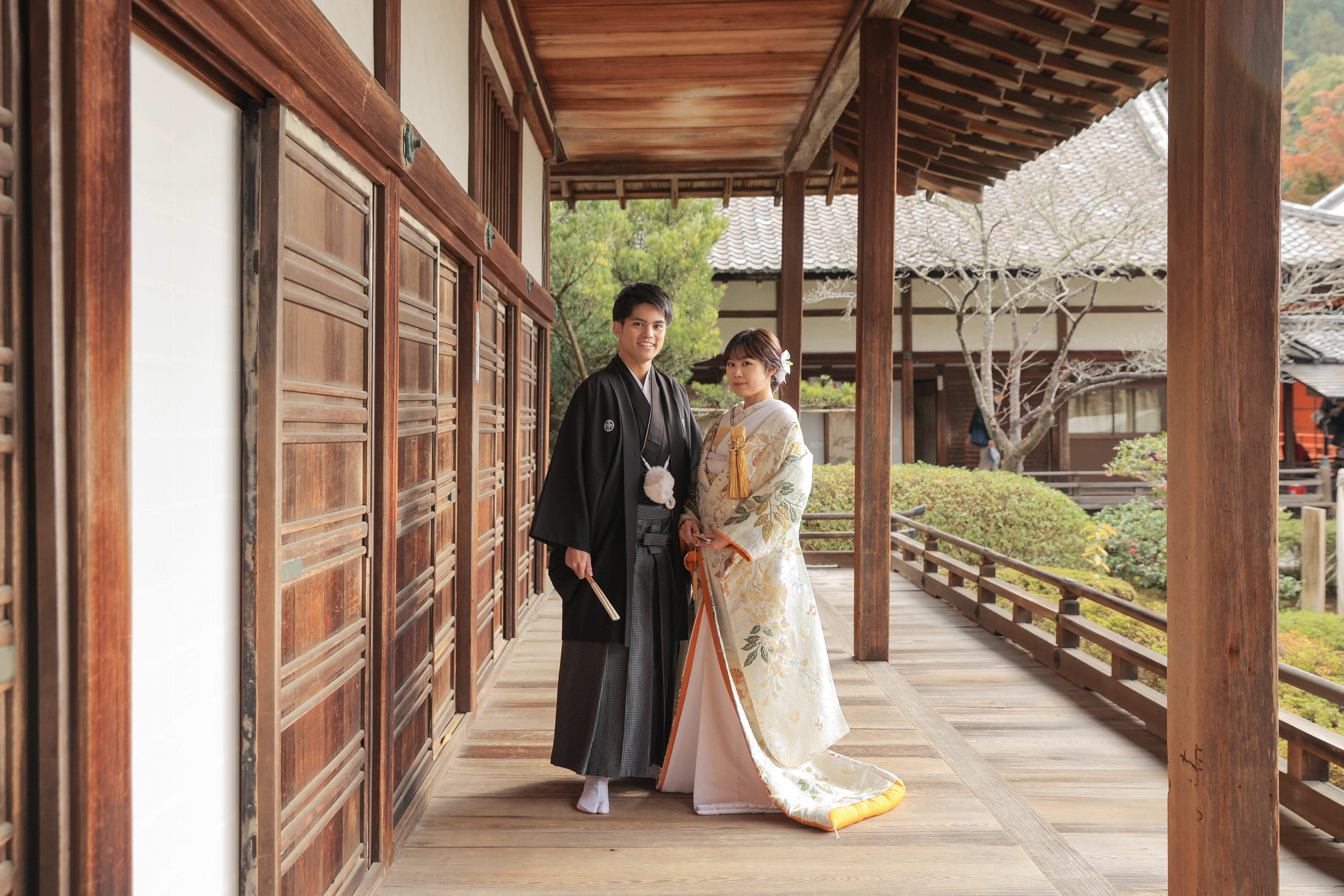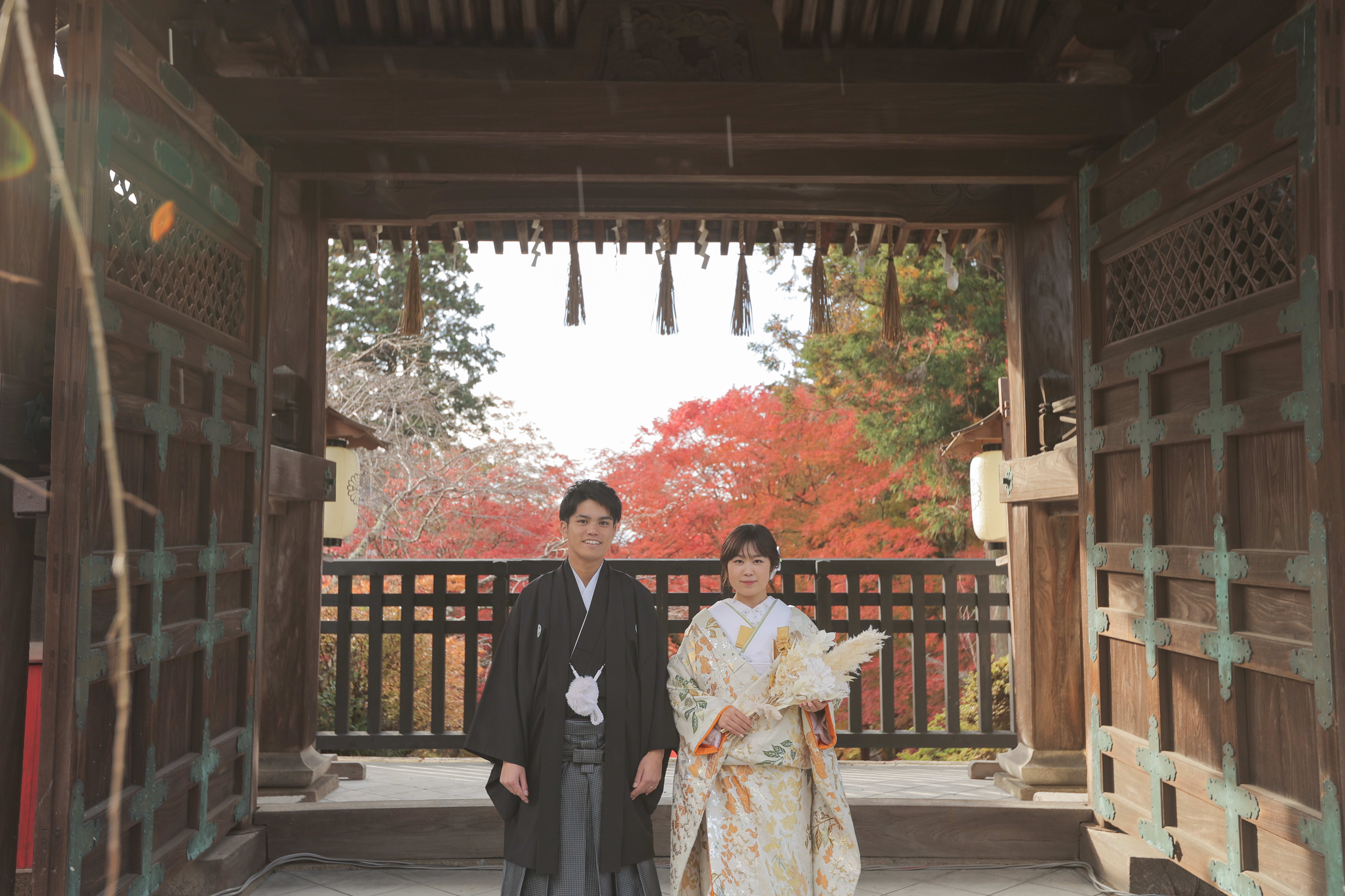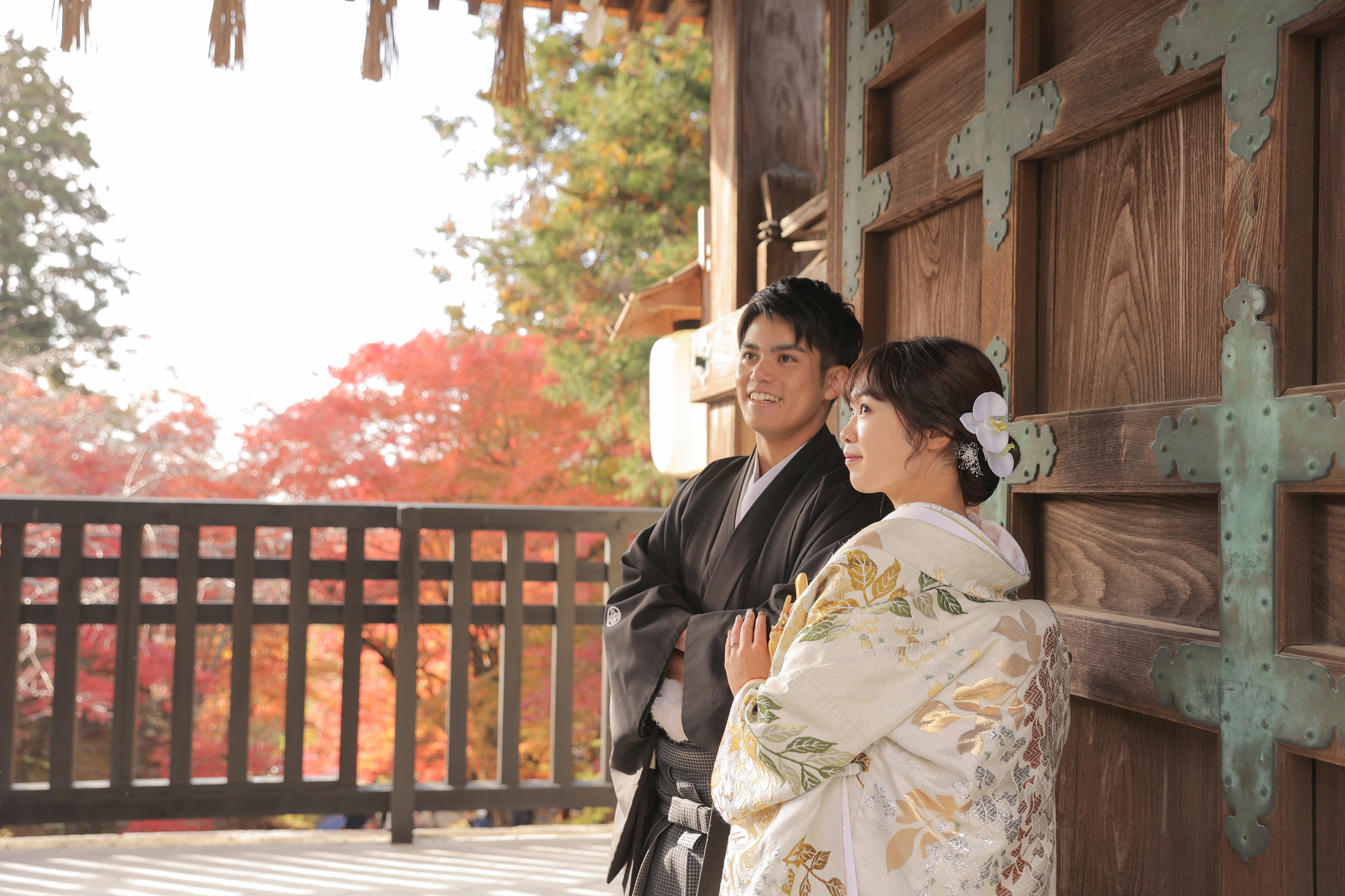 和装に馴染む神社仏閣らしい背景が落ち着いた印象を感じられますね。