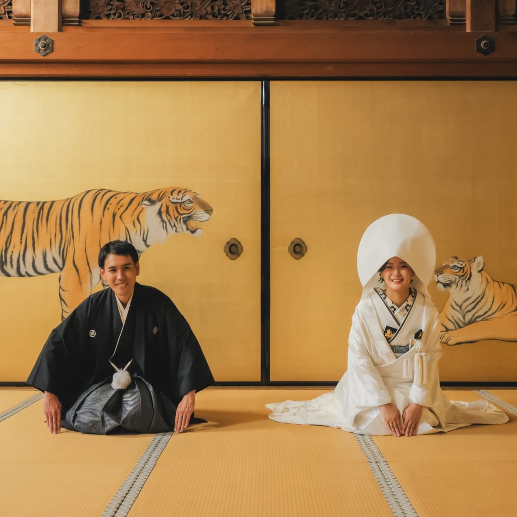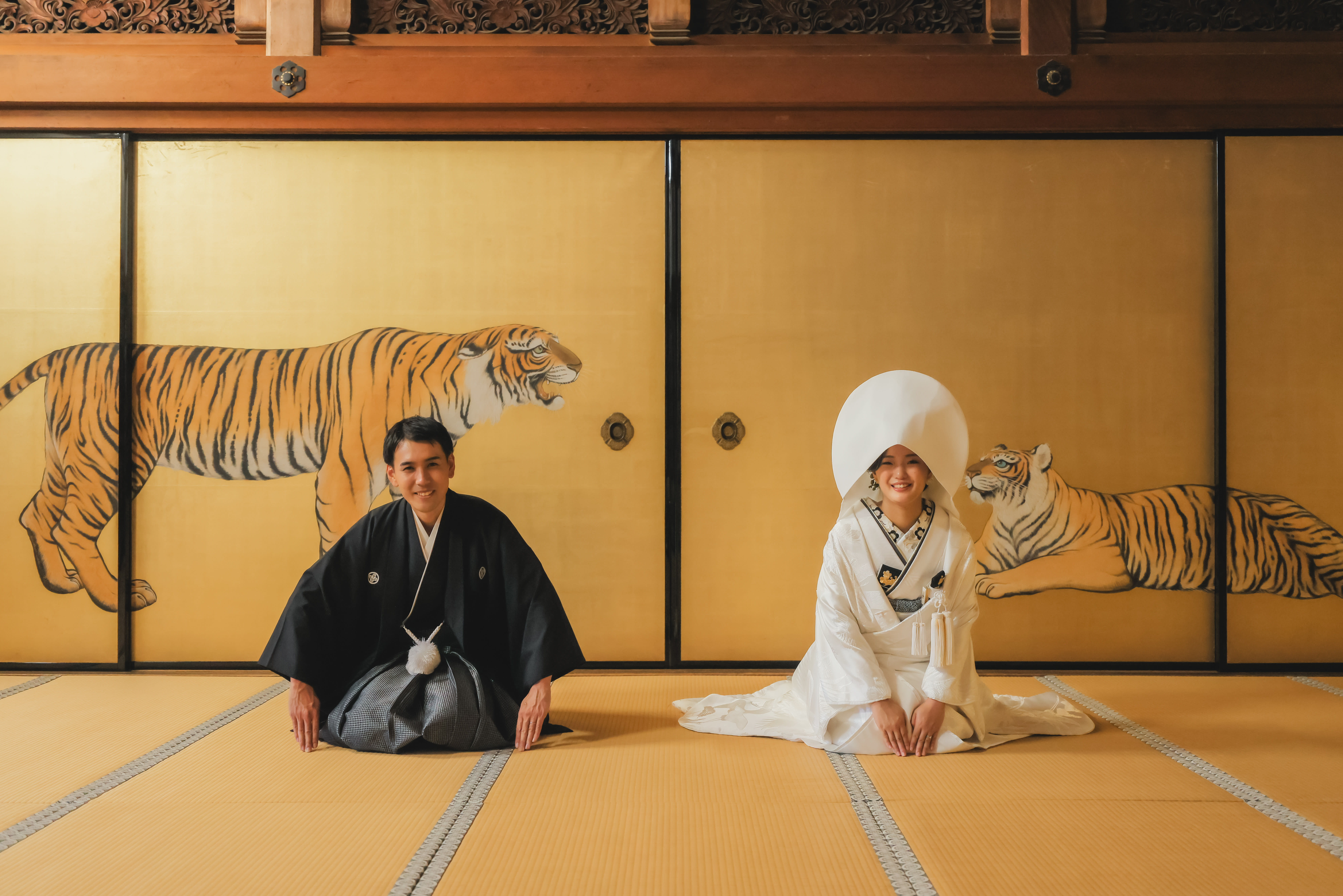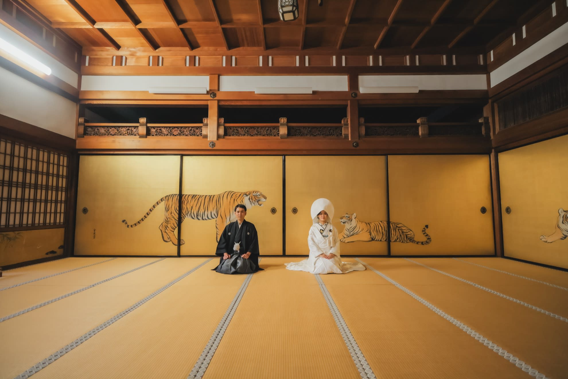 虎が描かれた金屏風のある和室で正座のカットをお撮りすることが可能です。