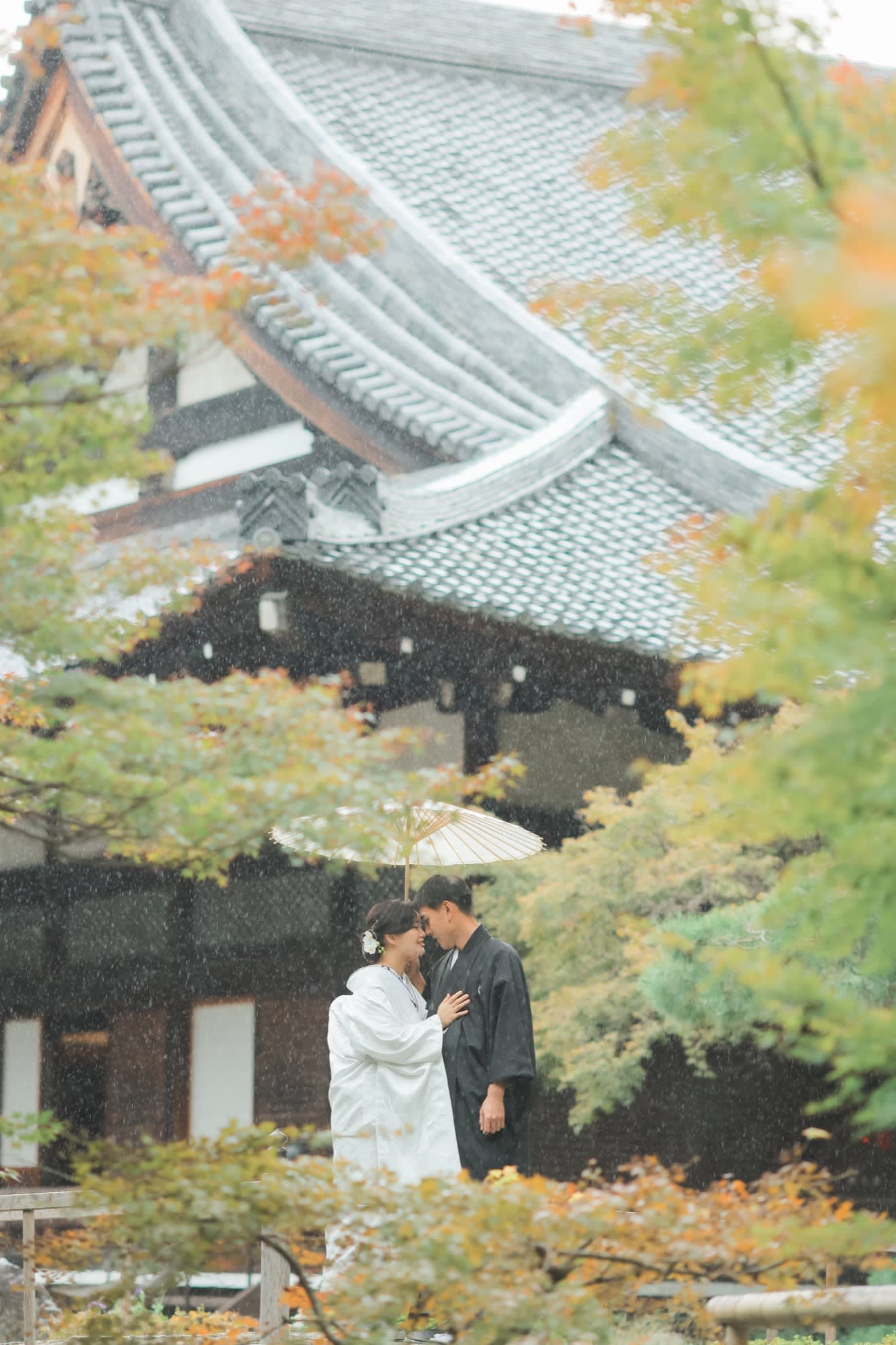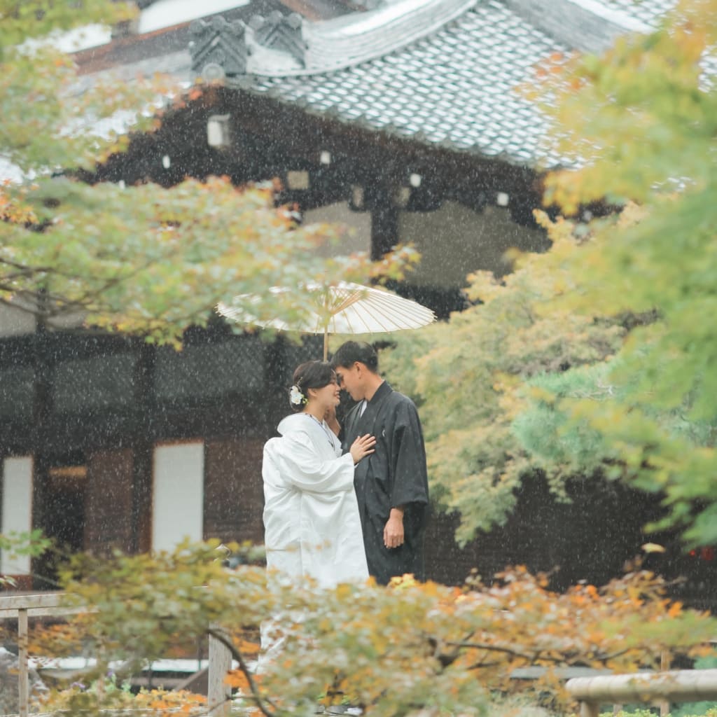 和傘を相合傘している新郎新婦様の姿はドラマの1場面を切り取ったかのようです。