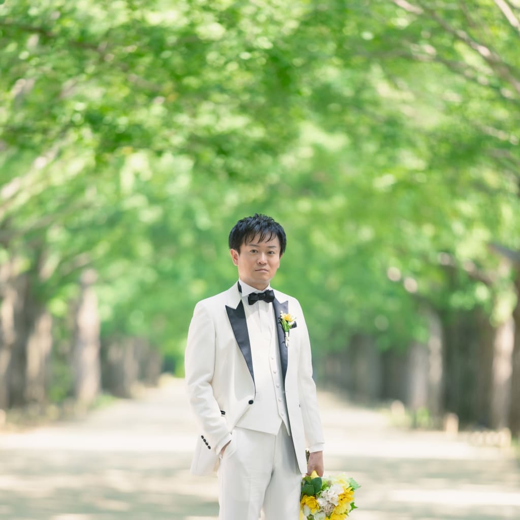 まずは銀杏並木の新緑で撮影スタートです!!! ご新郎様からご新婦様へ、ひまわりのブーケのプレゼントシーン♡