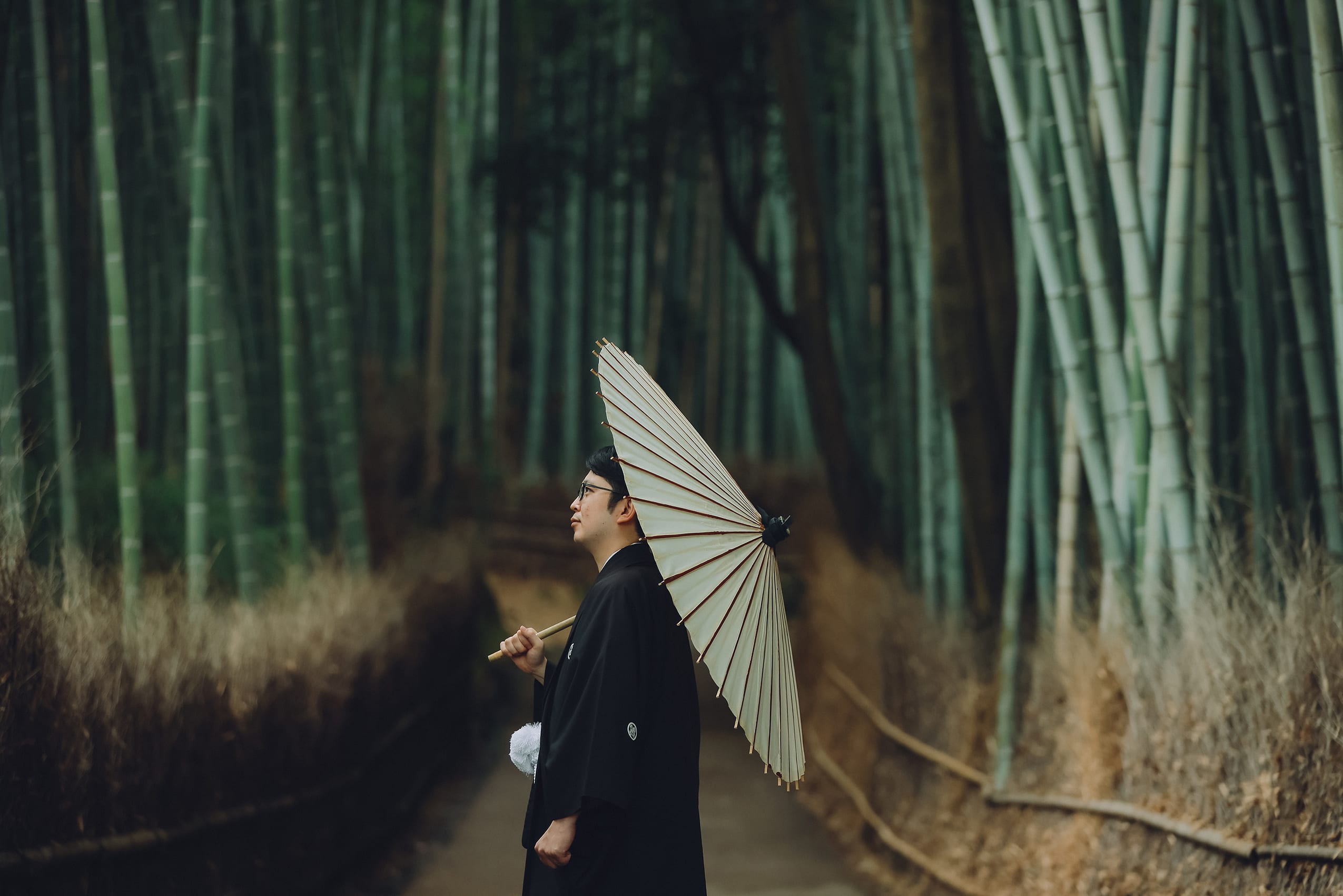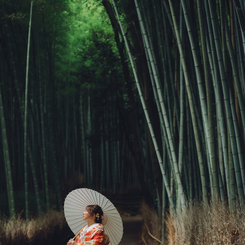 続いては和傘を持っての撮影。嵐山の竹林がお二人を際立たせてくれる一枚に。