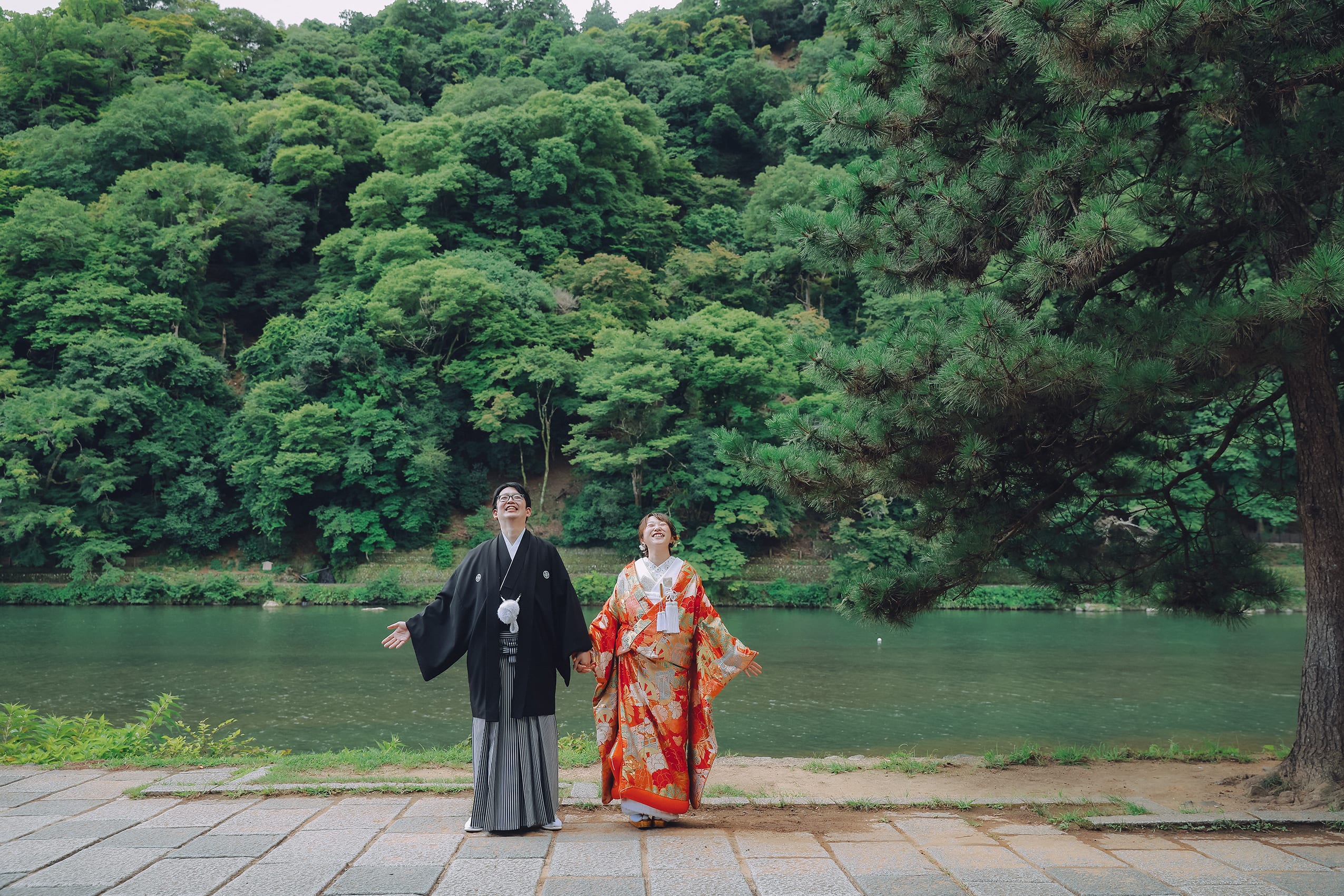 最後は渡月橋の前で撮影。大自然で京都らしいロケーションは嵐山がおすすめです!