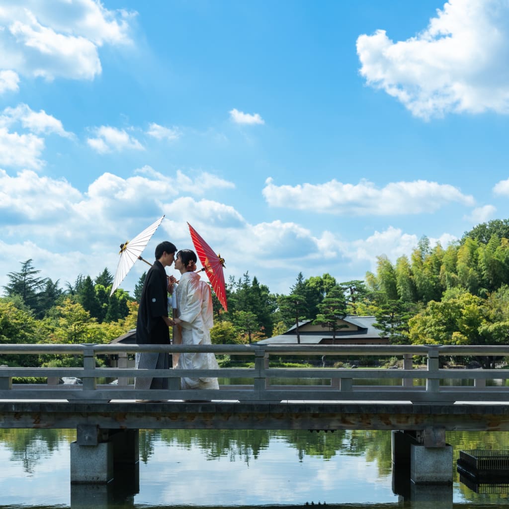 二カ所目は、日本庭園へ移動して撮影しました! 池に映る青空もステキでした。
