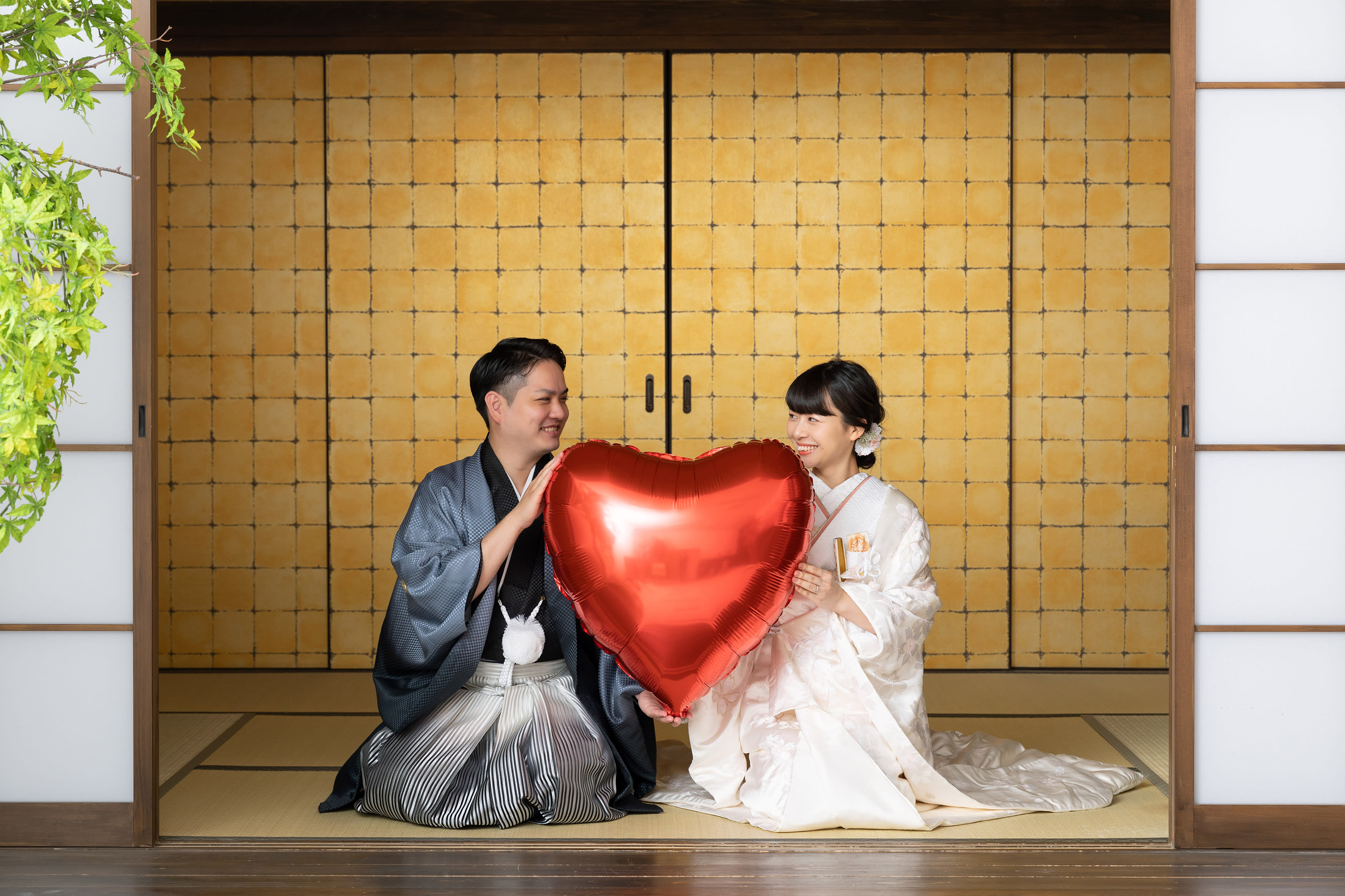 シンプルな白色の壁。ハートの風船を壁に貼って、可愛く指差しをしていただきました!
