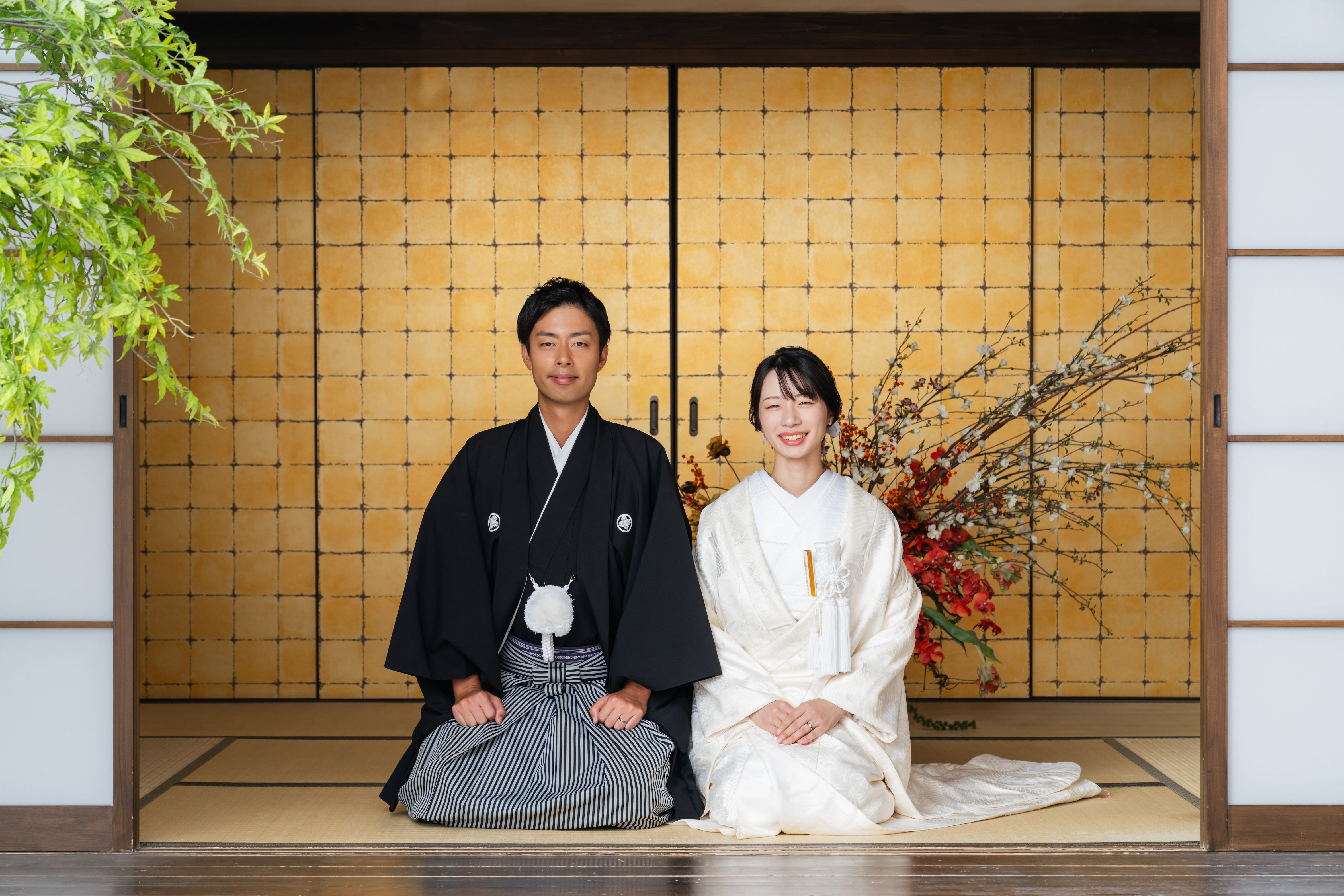 初めは椿の背景を使っての撮影でした!白無垢・紋付き袴姿がとても映えます!