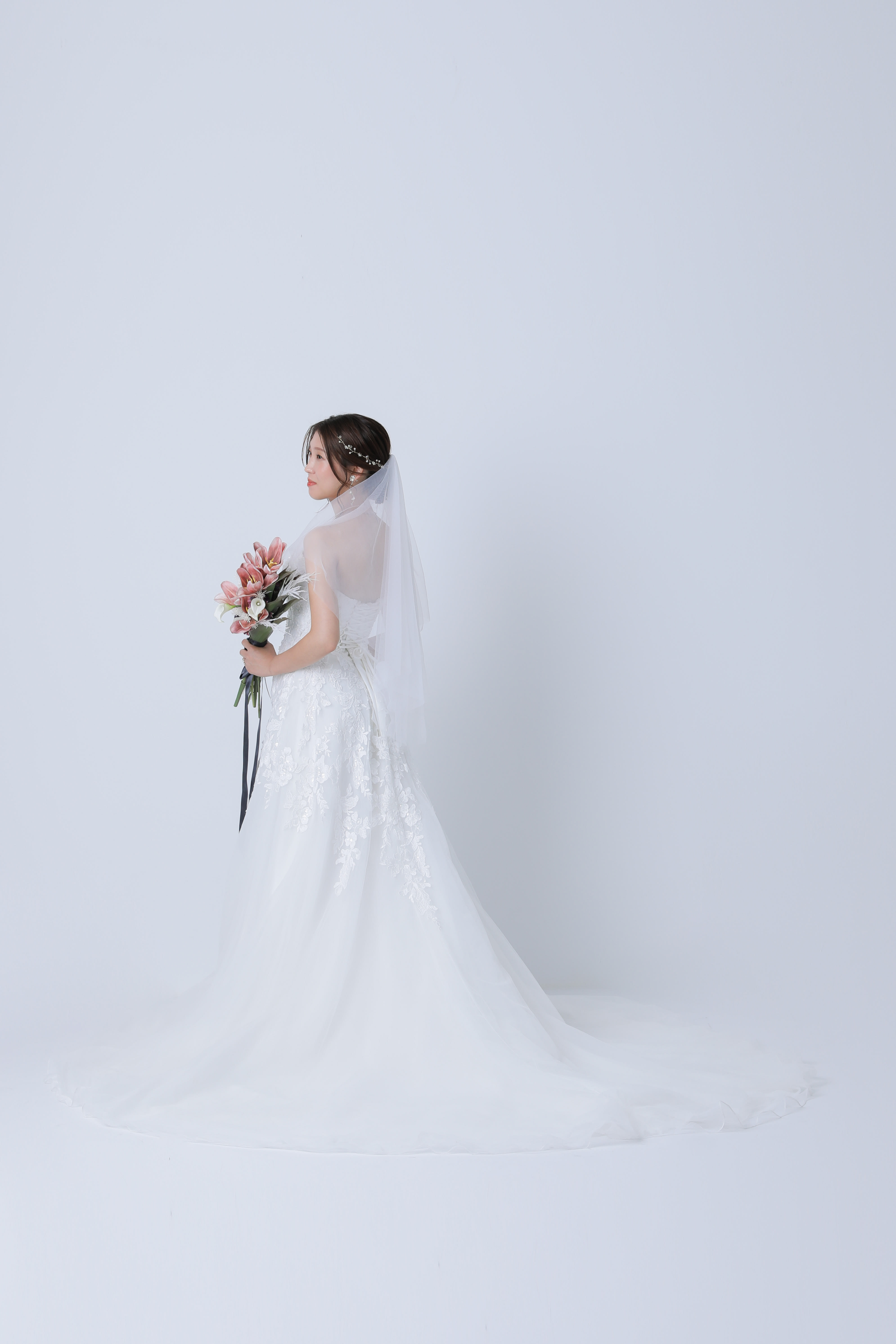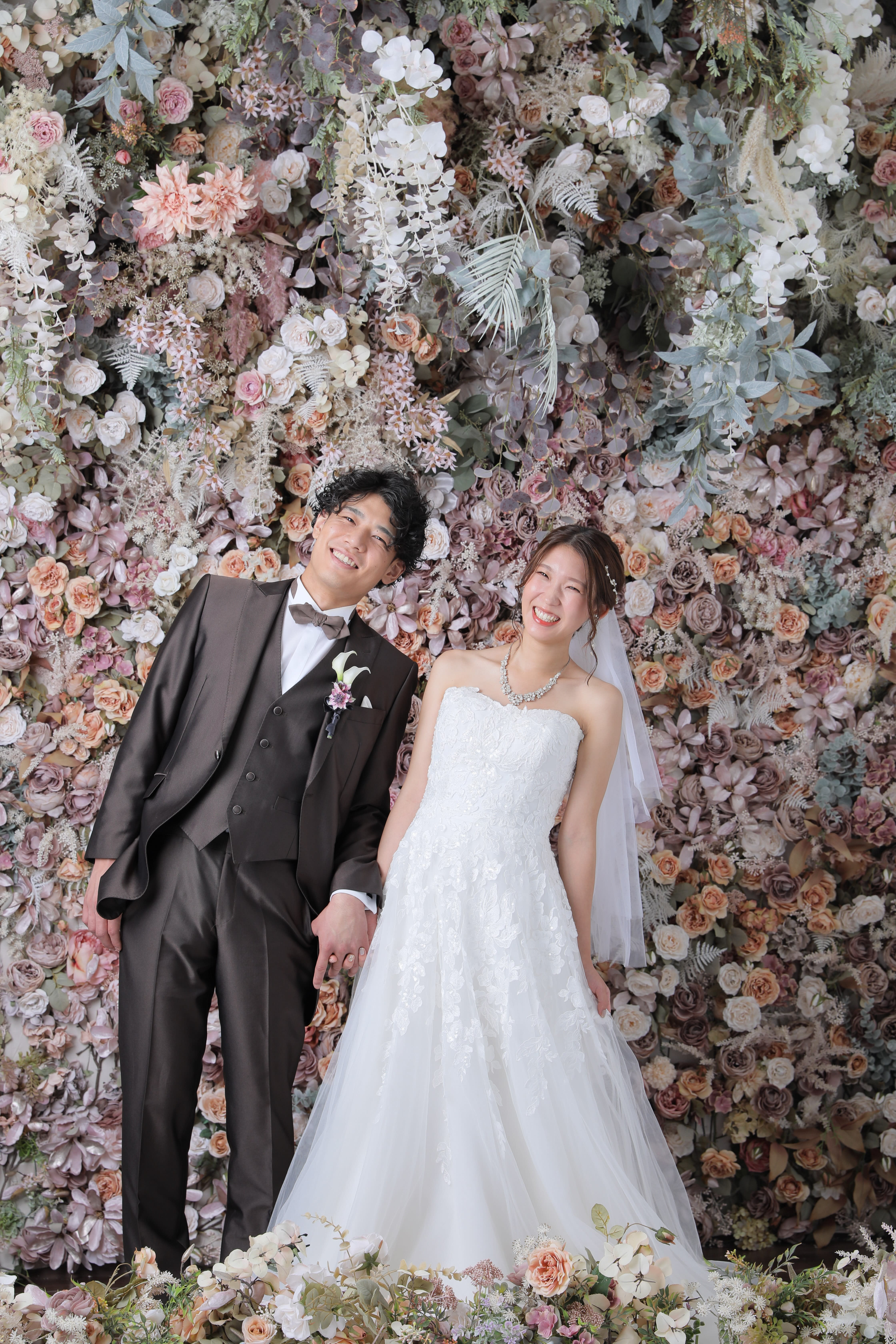 お花の壁の前でエレガントなポージングで撮影!!優しい笑顔!!