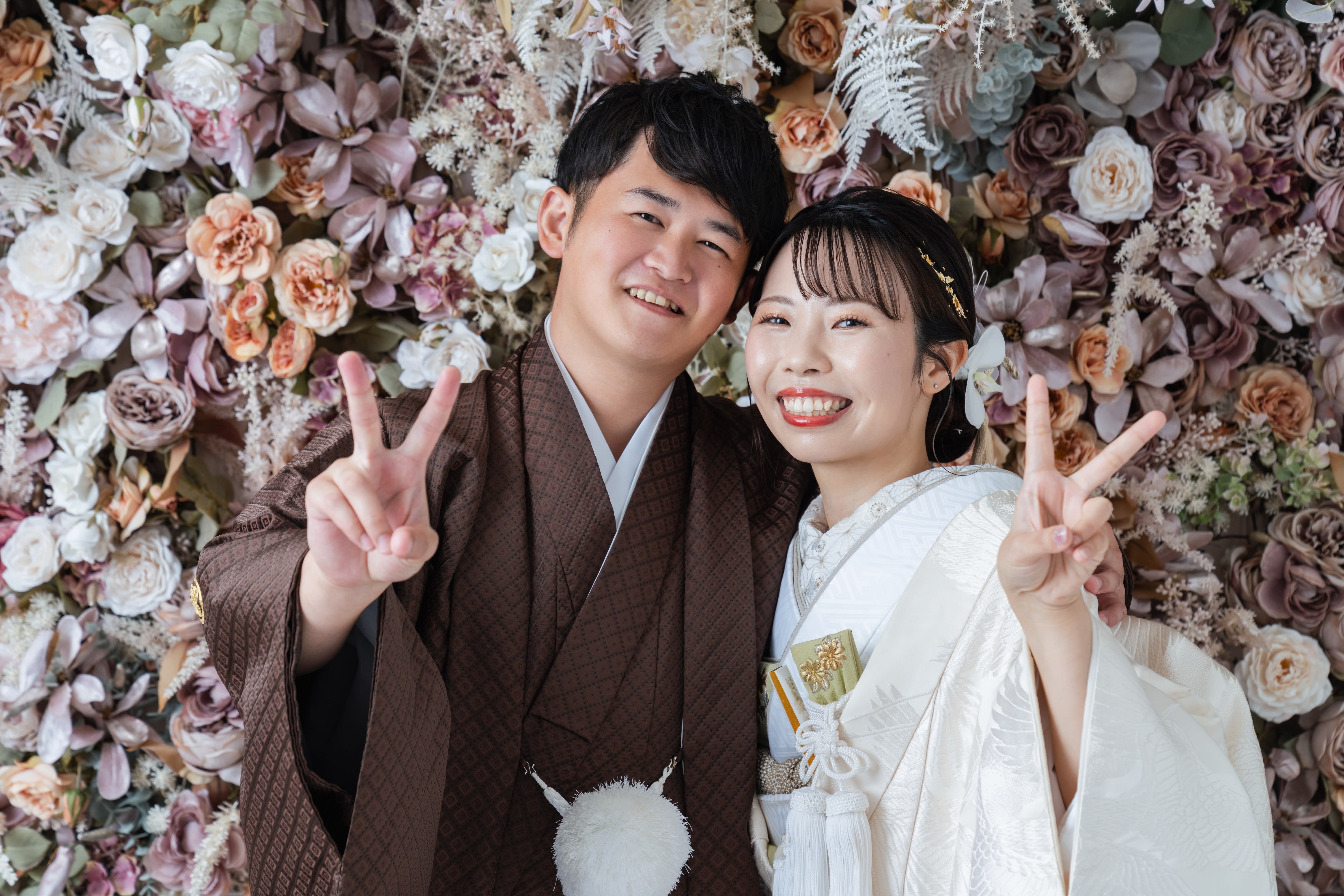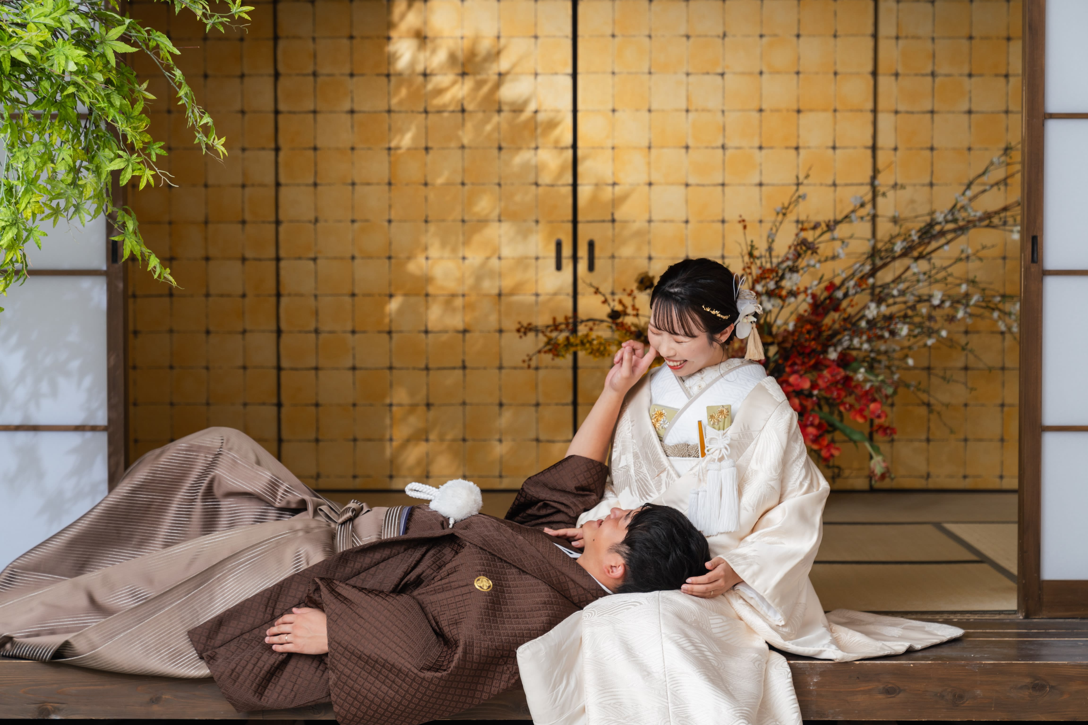 店内にある2つのスタジオで様々な雰囲気で撮影が可能です。 屋内庭園内の藤の花とのカット