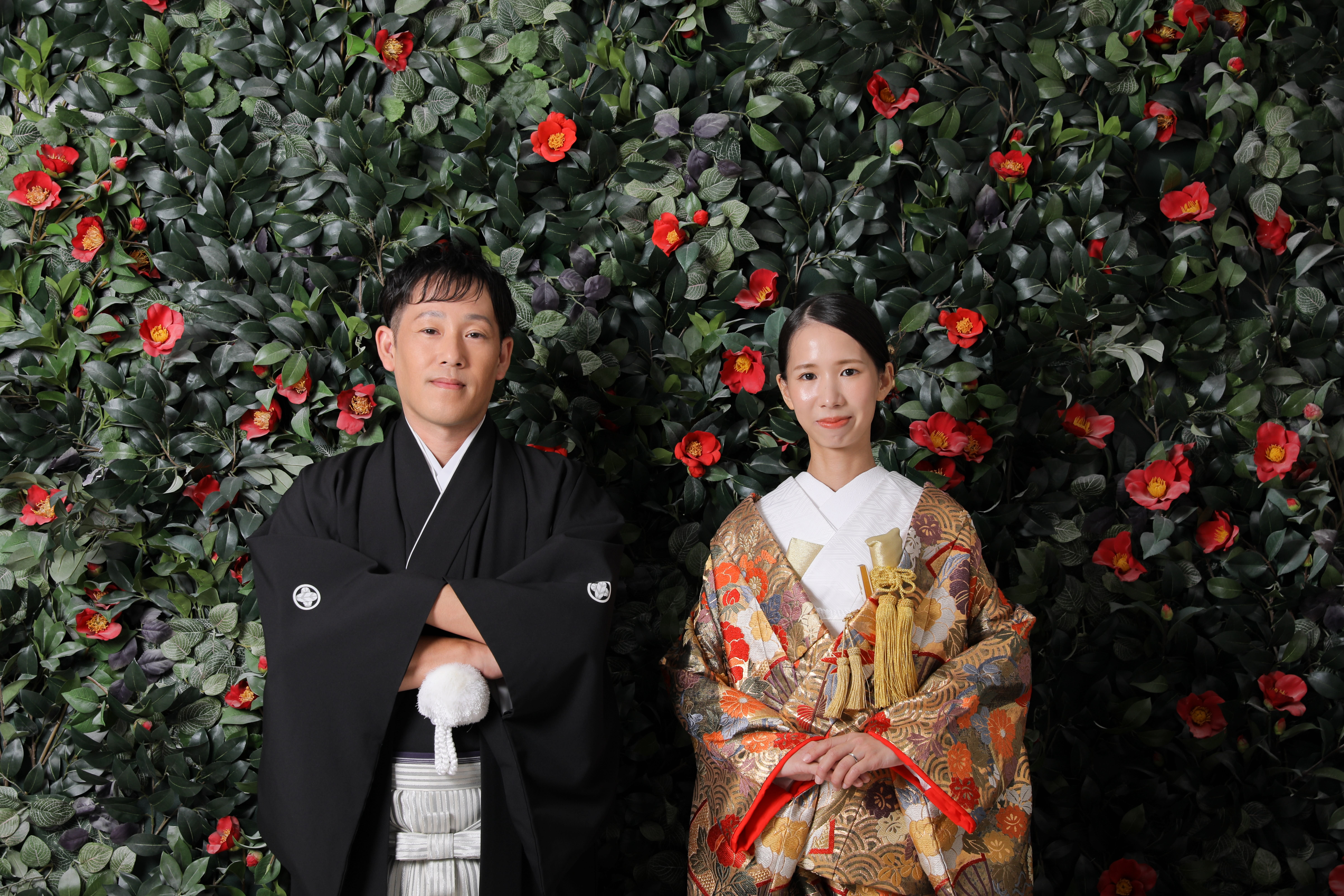 ピンクのお花の壁でお手繋ぎ!柔らかな笑顔が素敵です!