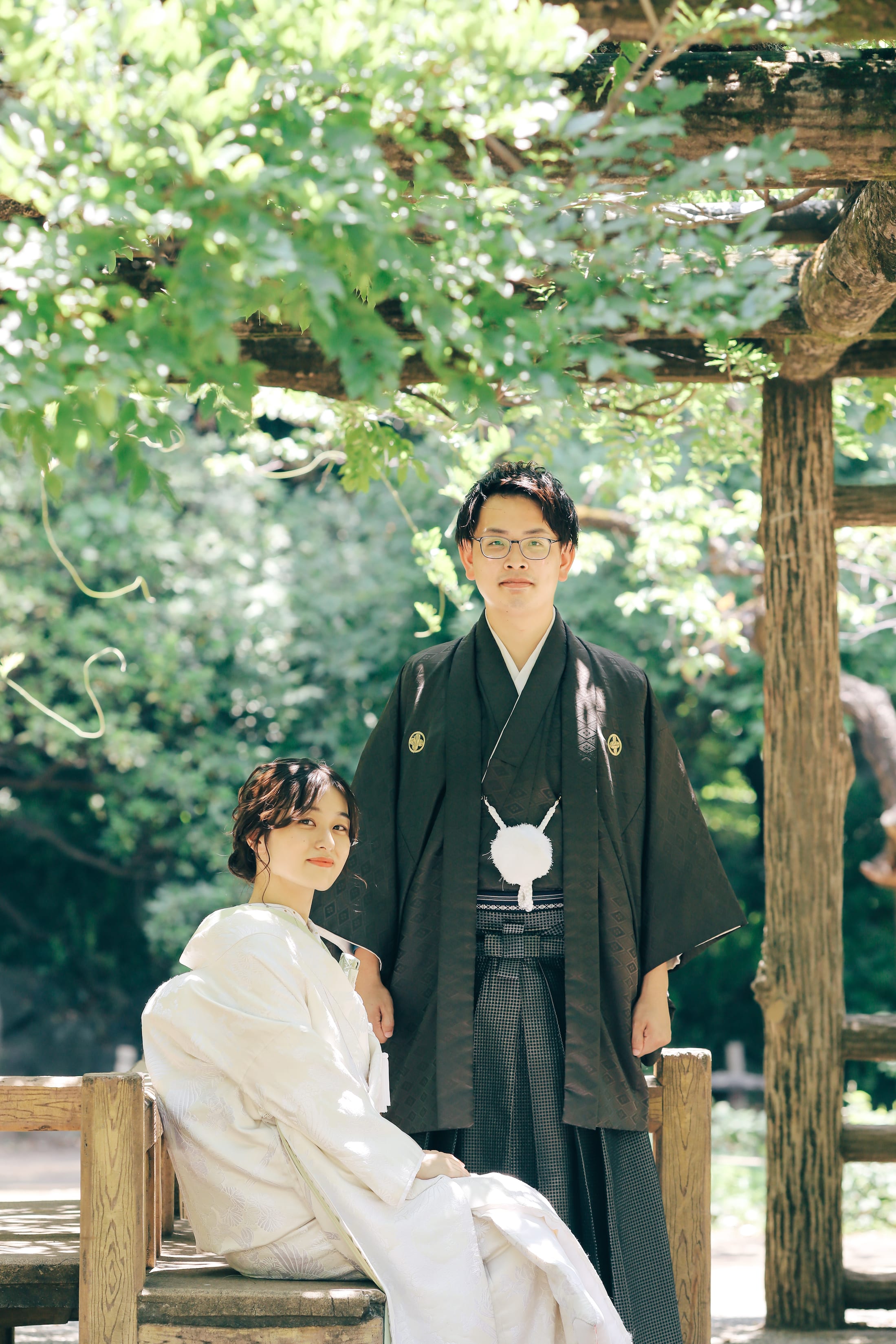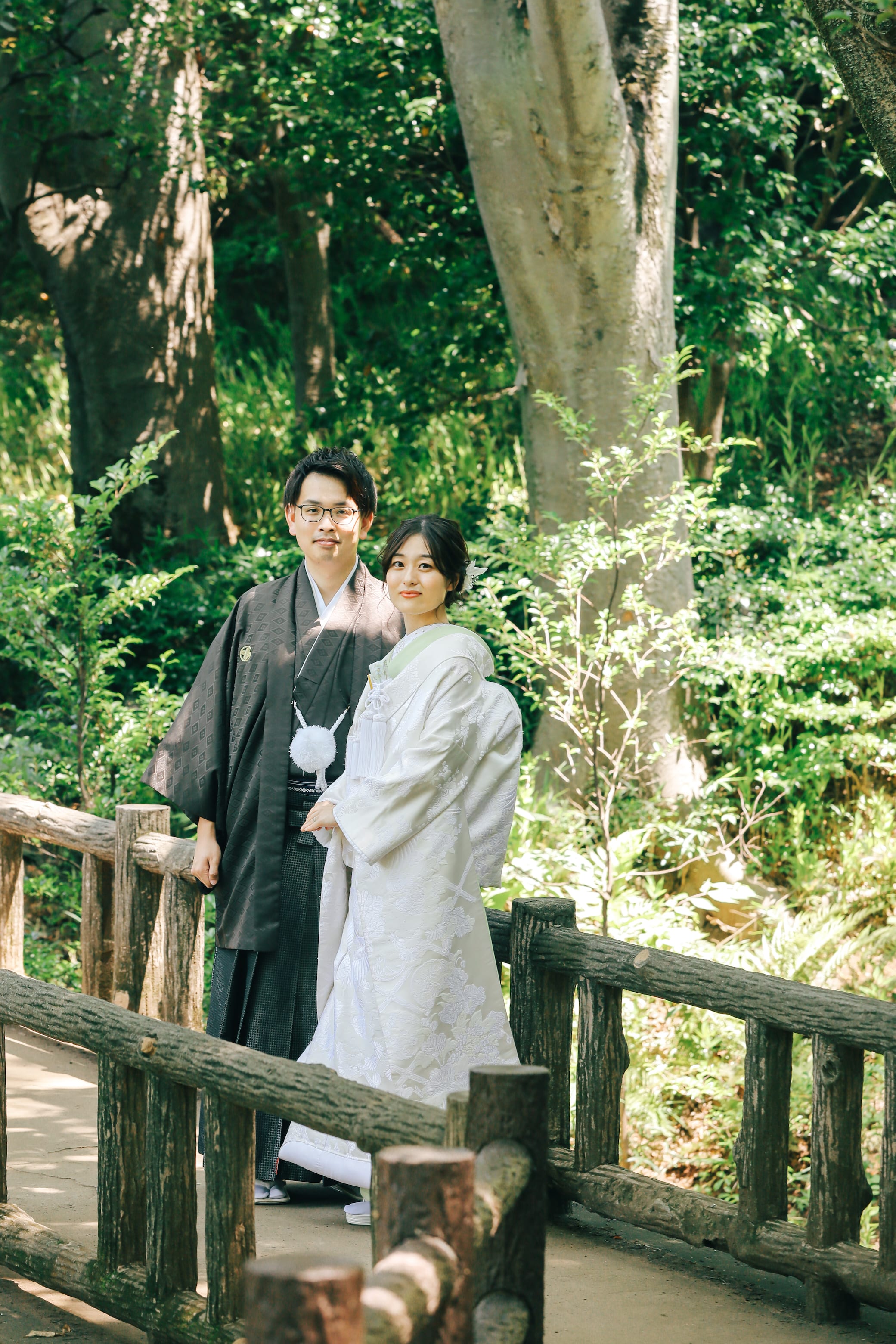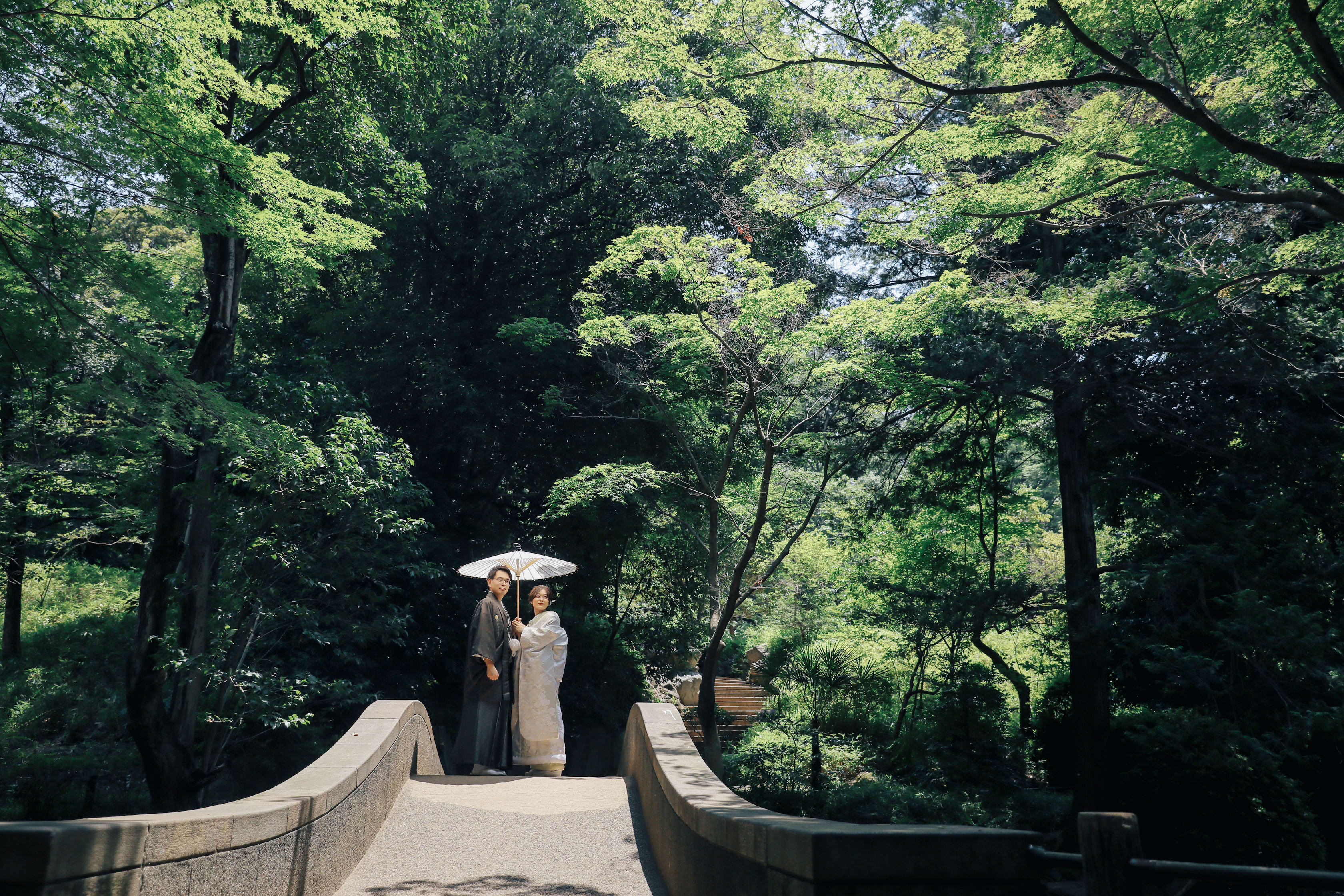 夏の日差しと深緑の中で傘をさせば、お二人だけがくっきりと浮かび上がるような幻想的な写真になりました。