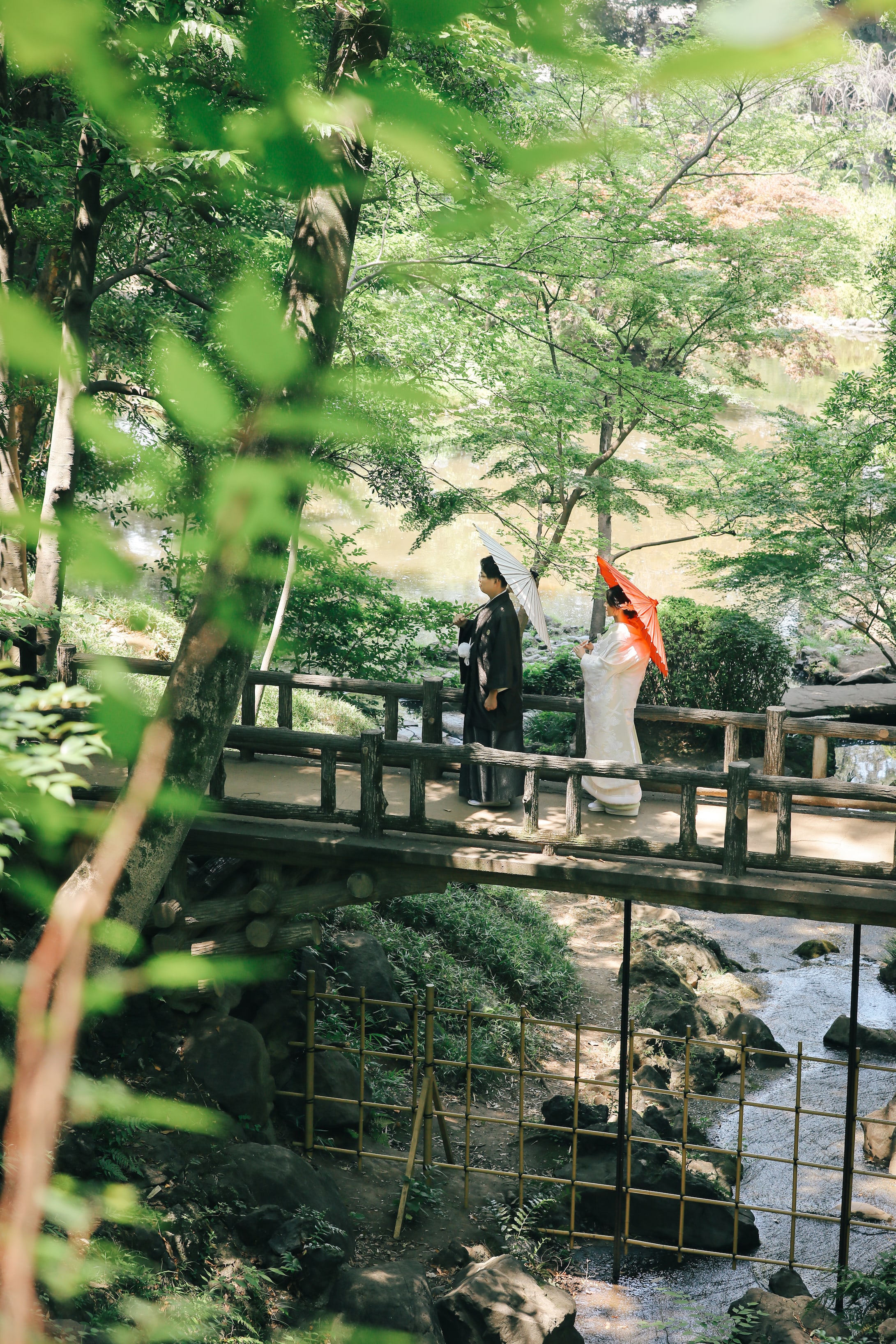 渓流の上にかかる橋を渡っているお二人。紅白の番傘がよくお似合いでした♪