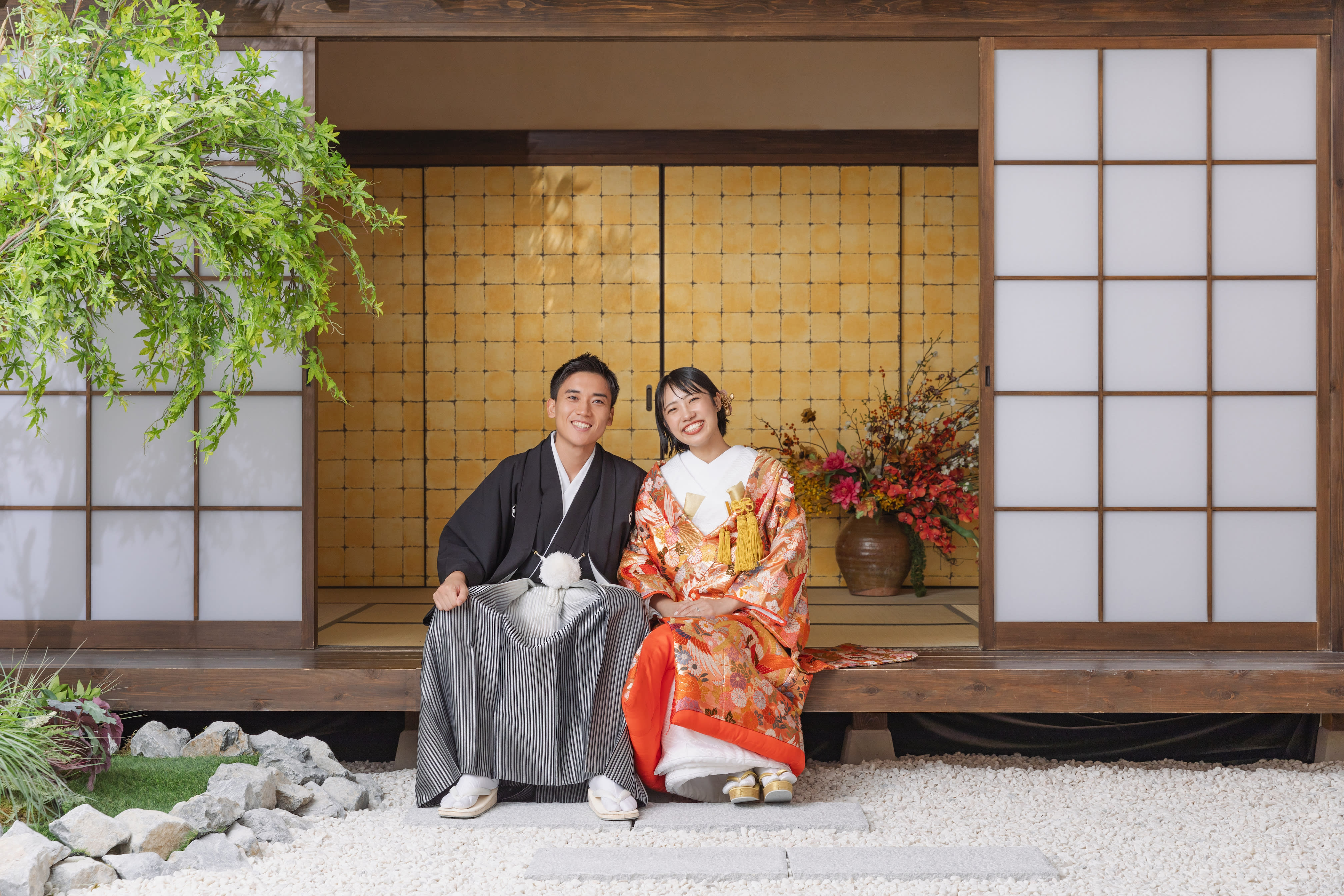 紅白の和傘を持って、椿の前で撮影◎ 1日ありがとうございました!末長くお幸せに♡