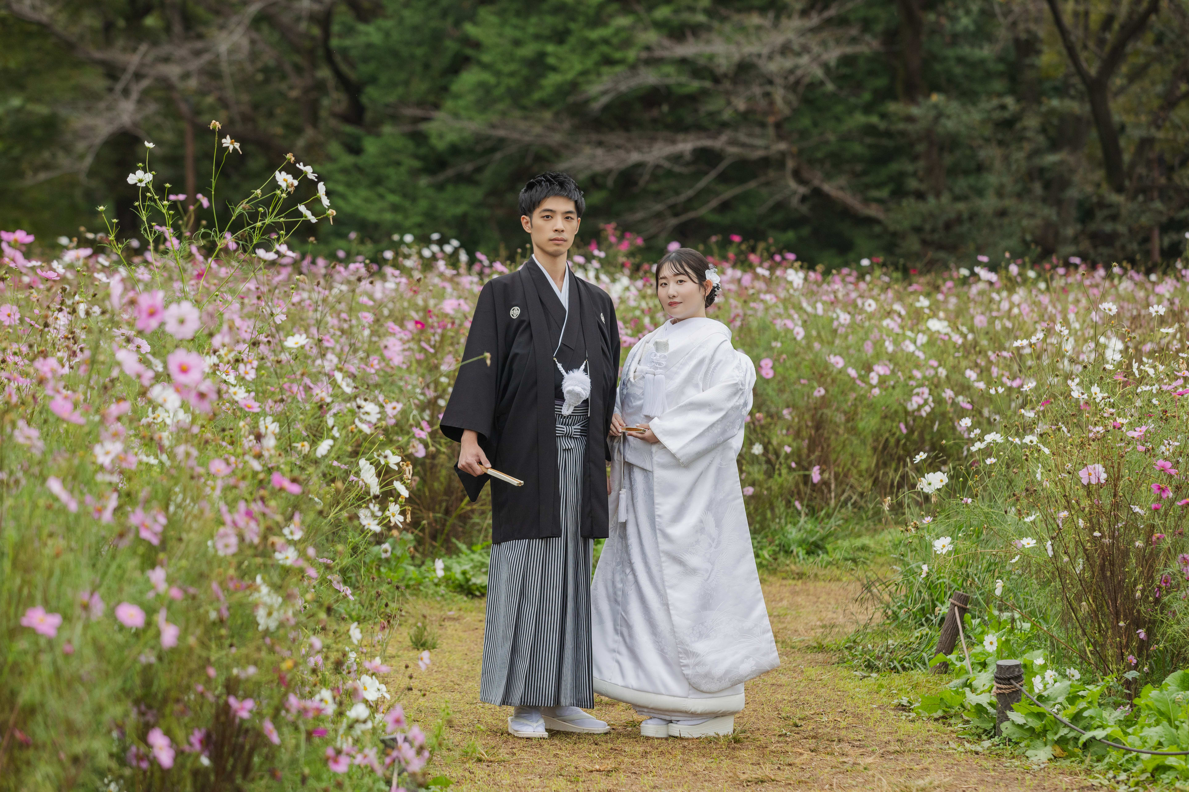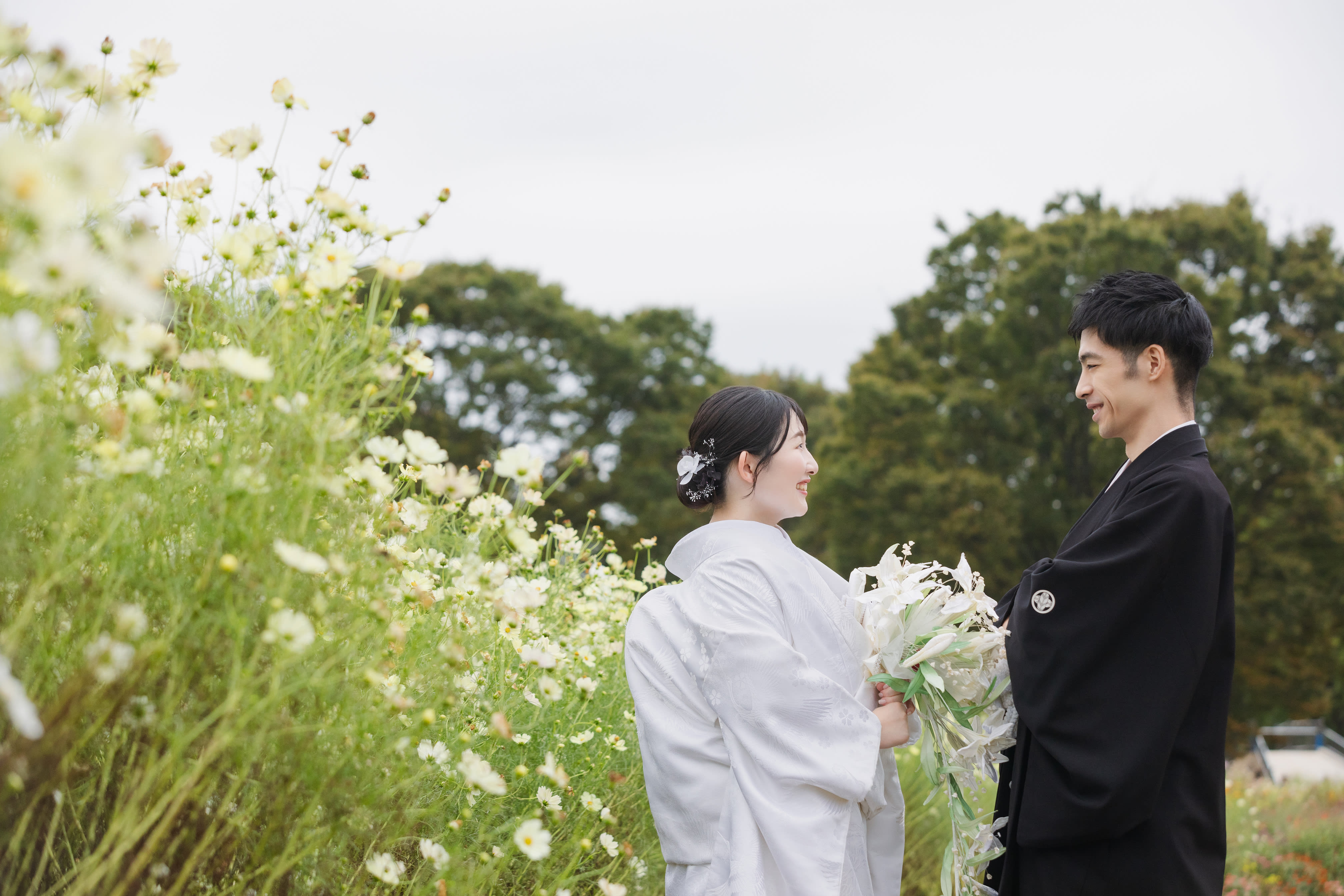 ブーケガーデンのカラフルなお花たちと撮りました♡ 白無垢にカラフルがすごく映えます♡