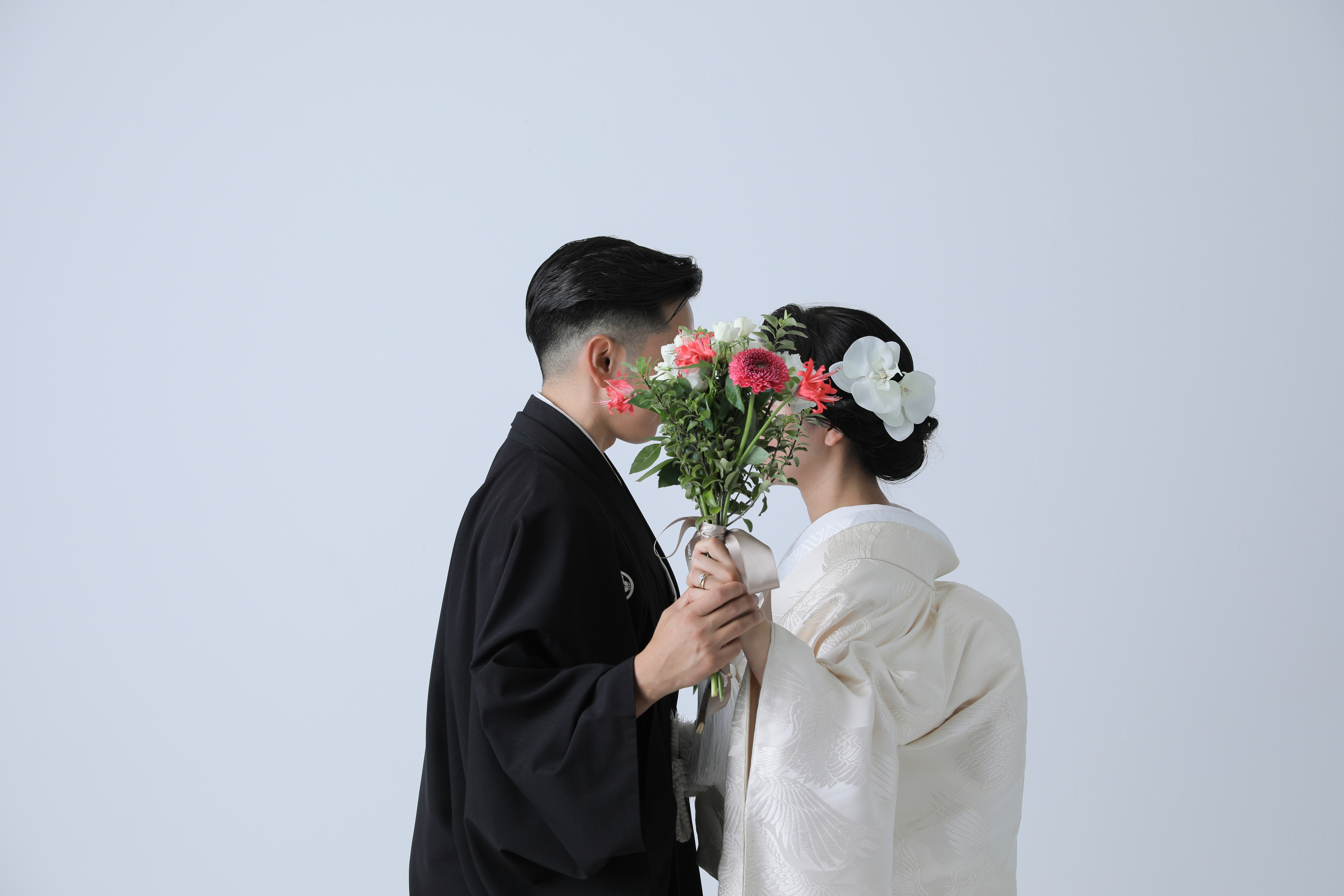 お持ち込みのブーケで背中合わせのお写真!!赤のお花も映えております!