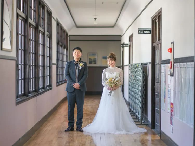 ドレスが少し大人っぽかったので、ヘアメイクはあえてかわいい感じに。新婦はもちろん、お友達にも大好評をいただきました。おふたりの思い出いっぱいの街での撮影。結婚という節目に、自分達の生い立ちを振り返るのはとても素敵な事だなと感じました。