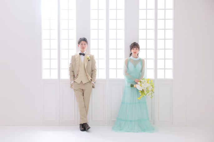 よく晴れた日の撮影でした。和装は白無垢の中に着る掛下や襟などにカラーを入れたお洒落なコーディネートがポイントになっていて、洋装も爽やかなミントグリーンのドレスが笑顔いっぱいの新婦様にピッタリでした。 おふたりからも積極的に撮影のアイデアを出してくださって、わいわい楽しい撮影になりました。
