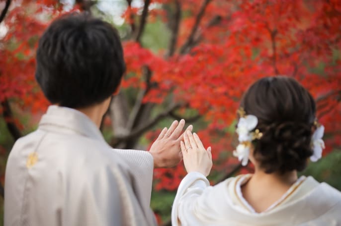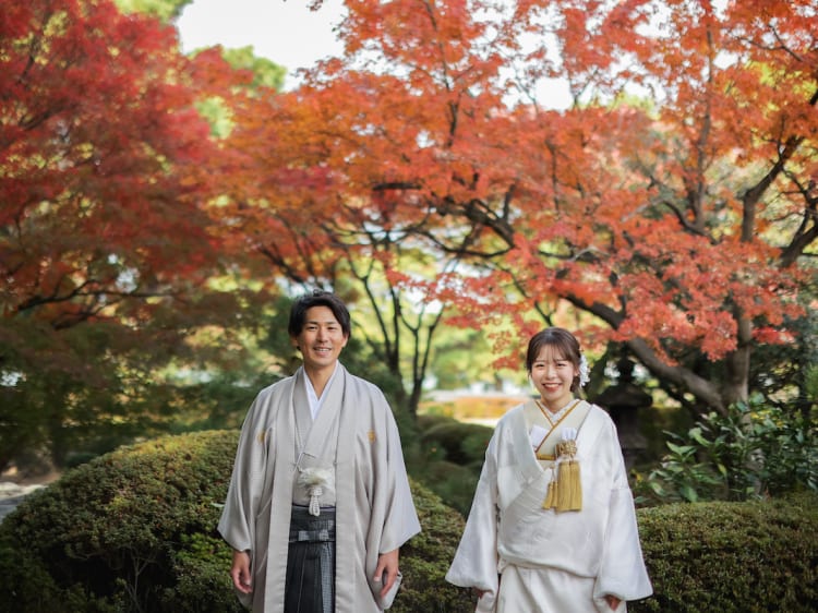 紅葉シーズンの和装撮影を選んだおふたり。 撮影当日は天気も良く、 色鮮やかな紅葉に囲まれての庭園フォトが実現。