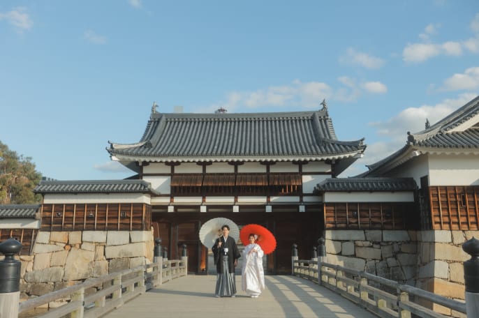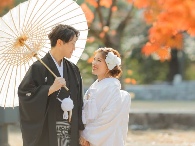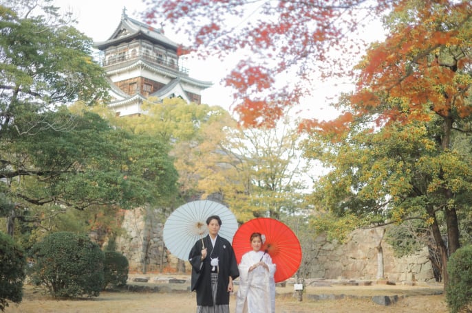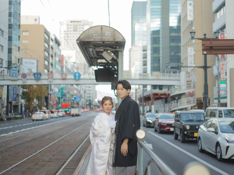 当日は天気も良く、おふたりと一緒に紅葉のきれいなスポットを探しながら、お散歩しながら撮影を進めました。広島城と店舗近くの電停で、広島ならではの写真も残すことができました。写真の仕上がりにご満足いただき、喜んでいただけたことが嬉しかったです。私たちにとっても素敵な思い出になりました。
