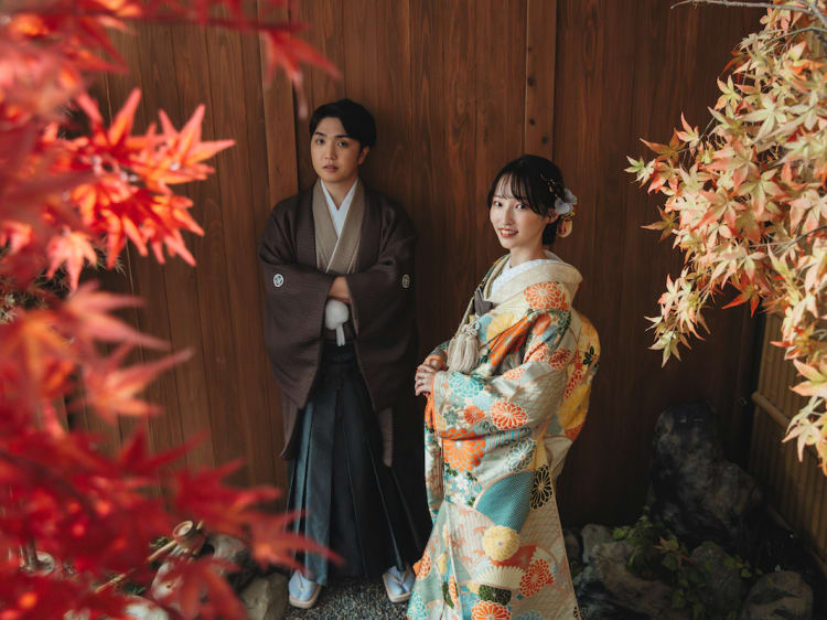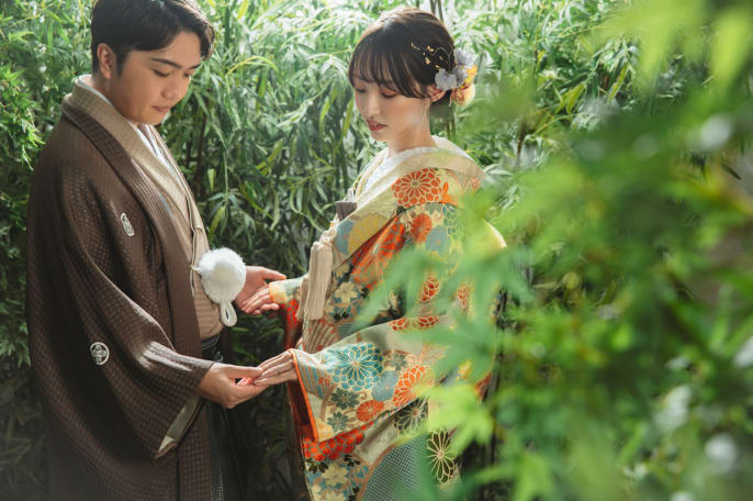 来店時は希望プランや撮影場所が 決まっていなかったおふたり。 一枚一枚写真を見ながら相談し、 屋内庭園スタジオでの和装撮影に決定。