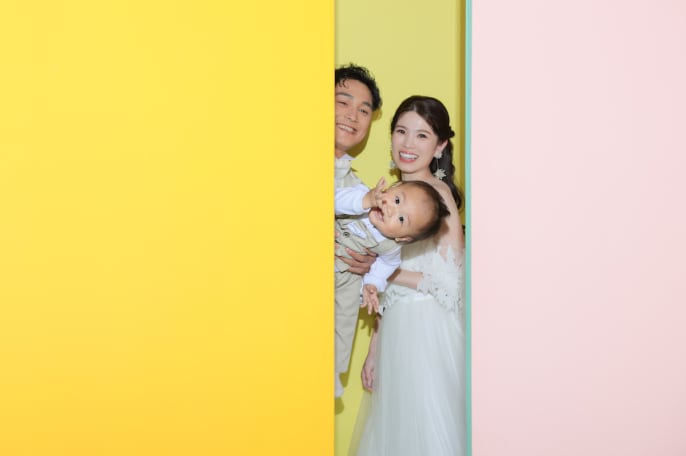 和装撮影のときはお子様が泣いてしまう場面もありましたが、お昼寝をしてご飯を食べたあとの洋装撮影では、とてもいい笑顔を見せてくれるようになり、3人揃っての笑顔ショットをたくさん残すことができました。おふたりにとって、そしてお子様や親御様にとっても、素敵な思い出になっているといいなと思います。