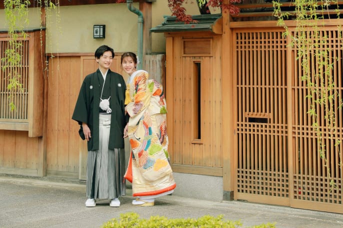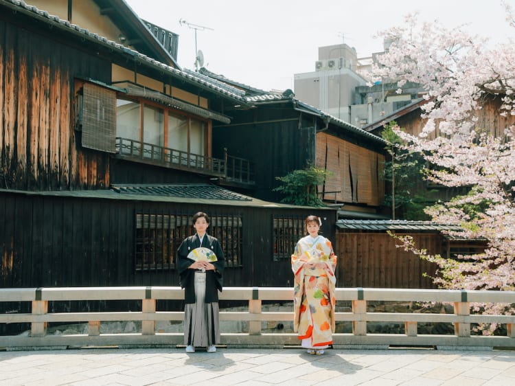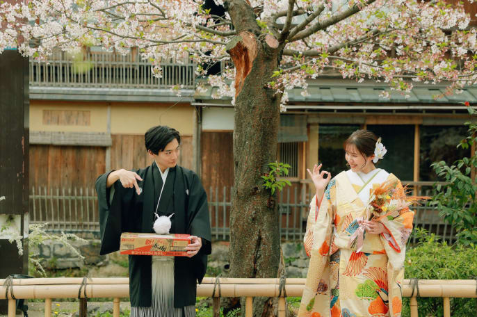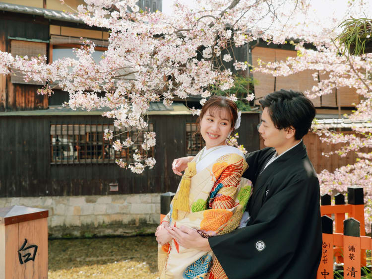 鮮やかな桜との撮影が ご希望だったおふたりは、 春の祇園での ロケーションフォトを選択。