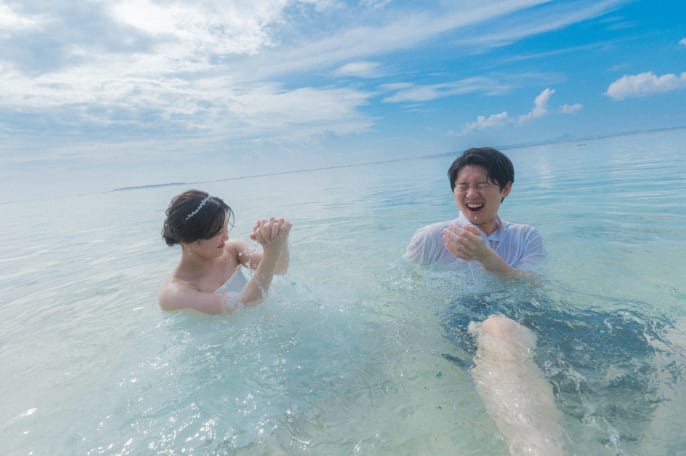 沖縄の海を舞台に楽しく撮影することを 希望していたおふたり。 美しいビーチの中でも 特にふたりのイメージにぴったり合った、 透明度の高い瀬底ビーチで撮影することに。