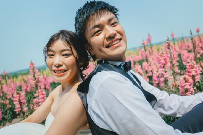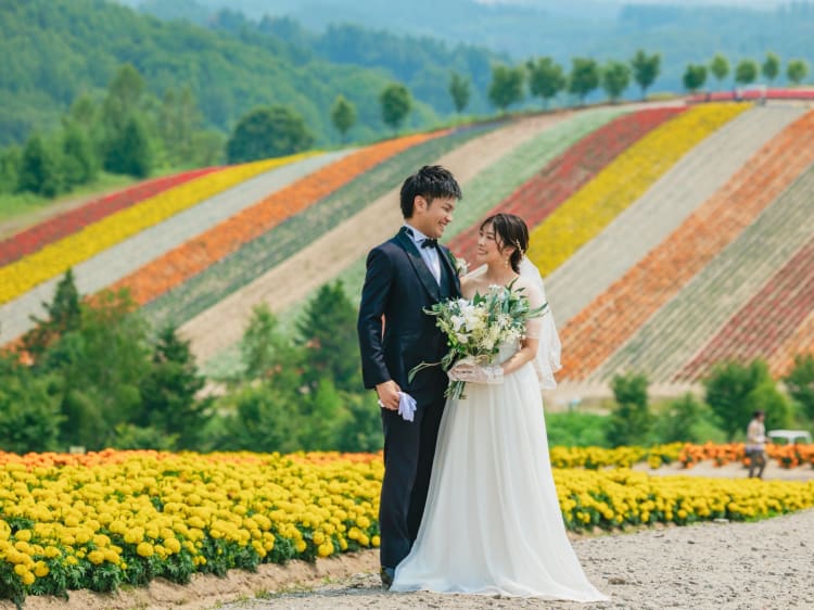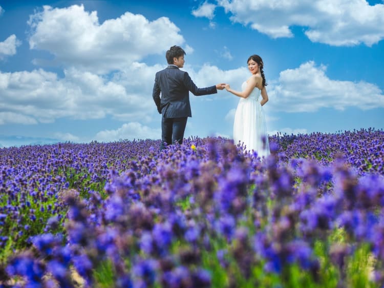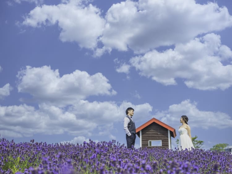 初めての北海道旅行を兼ねた撮影で、 お花畑を満喫したいと希望していたおふたり。 ラベンダーの見頃とおふたりの誕生日の 日付を考慮して日程を決定。