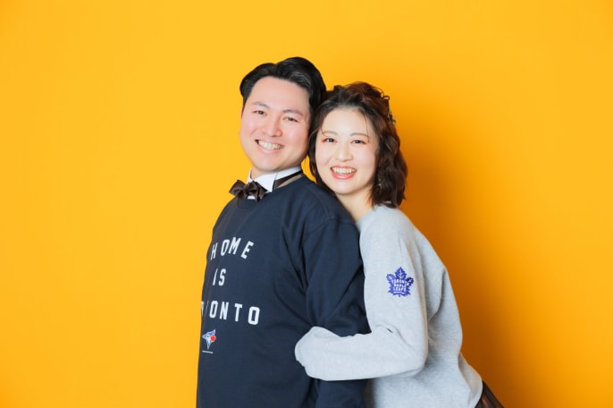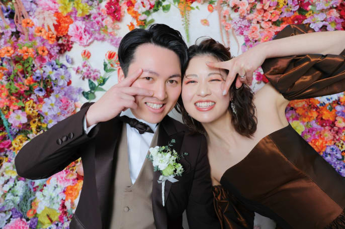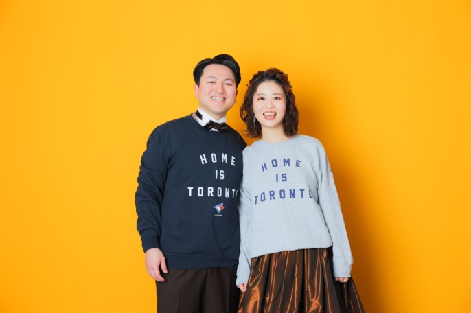 洋装では、新婦様はふわっとしたニュアンスヘアをご希望でした。ドレスに合わせて濃いめメイクで大人っぽく仕上げ、リップの色もとてもお似合いでした。撮影は、おふたりの明るい雰囲気をそのまま活かして表情豊かに。思い入れのあるトレーナーなど、アイテムも活かしながらの楽しい撮影でした。