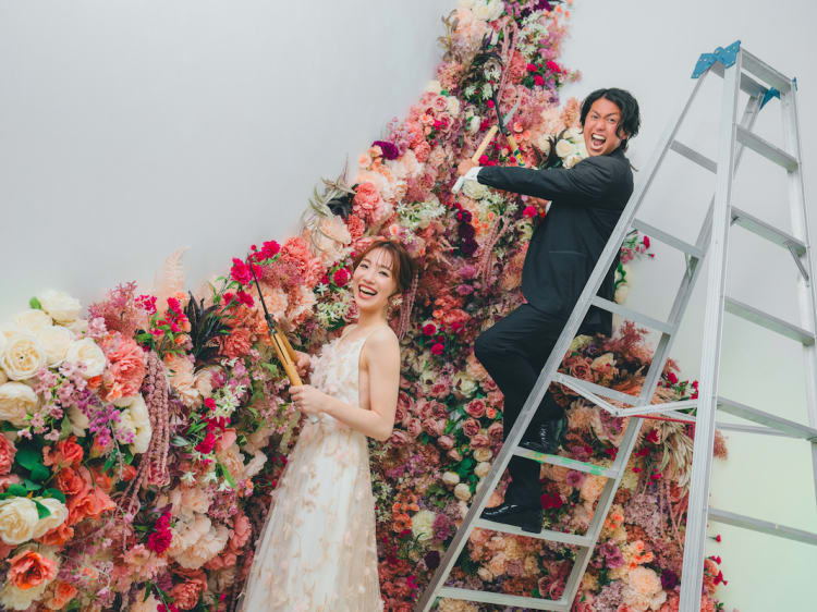 一面お花の壁が登場!ハウススタジオで撮影する洋装ウェディングフォトプラン