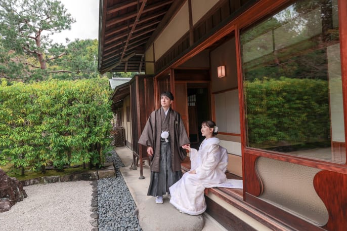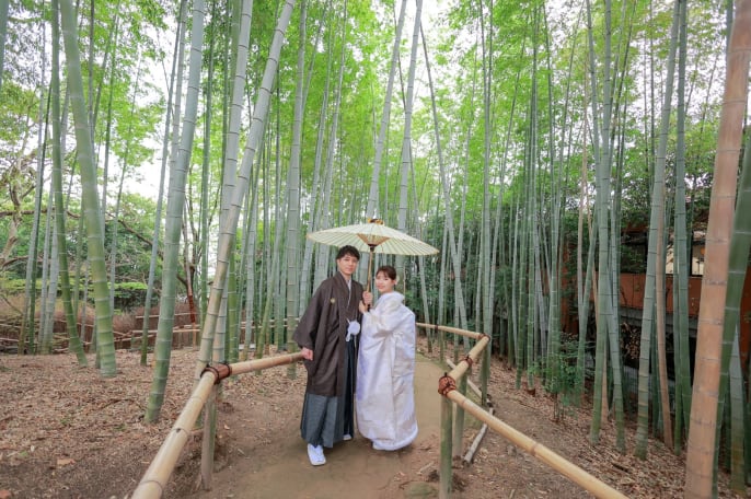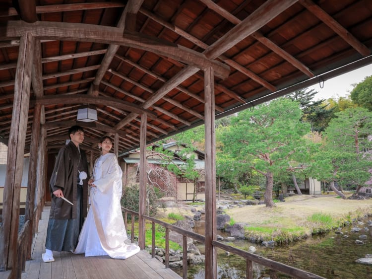『水の物語』をテーマにした日本庭園で撮る結婚写真。