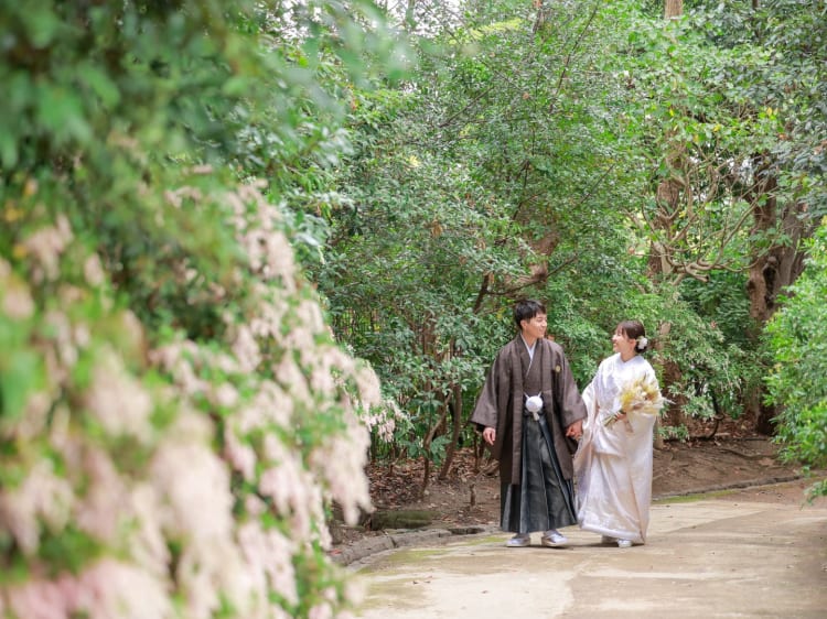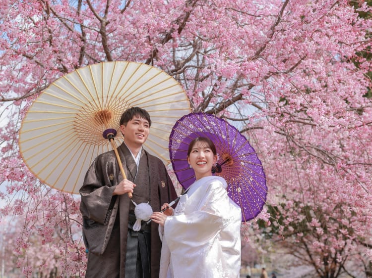 和装に合うロケーションを 希望していたおふたりは、 桜の季節に合わせて 愛知・白鳥庭園での撮影を決定。