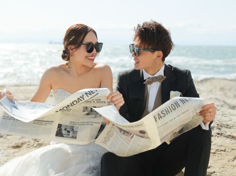 新婦様のヘアは、タイトにまとめてクールな印象に仕上げました。英字新聞やサングラスなど、おふたりの撮影アイテムのアイデアが、海ともマッチしてとても可愛らしかったです。強風の中での撮影でしたが、結果的には風も味方してくれました。愛車との写真も喜んでいただけてよかったです。