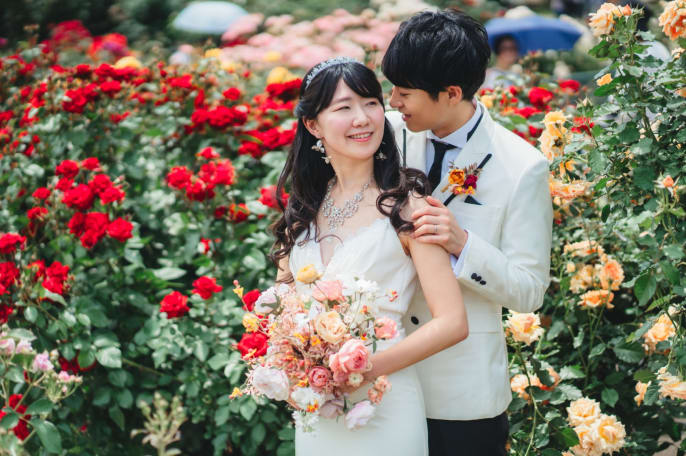 おふたりのご希望のテイストは、バラ園のイメージともぴったりの可愛い・ロマンチック系でした。場所に合わせてポージング、表情などをご提案しながら撮影しました。実は来園者がとても多い場所なのですが、構図の工夫とレタッチで、ご希望に合う雰囲気の写真を残すことができたかなと思います。