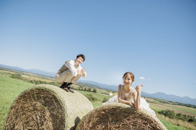 美瑛の牧場を舞台に撮影することに決定し、 衣装はやわらかな色味で 統一したコーディネートにして ふたりらしさを演出。