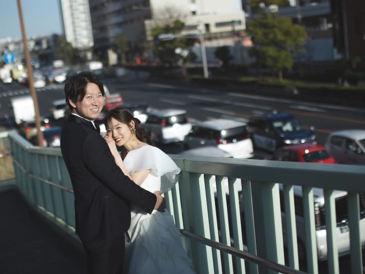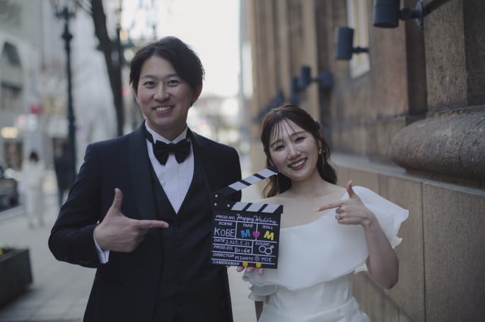神戸旧居留地での 洋装ロケーション撮影を選んだおふたり。 撮影当日は天気にも恵まれ、 明るい日差しが降り注ぐ中、 歴史ある美しい街並みを背景に ゆったりと歩きながら撮影。