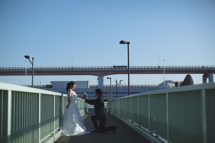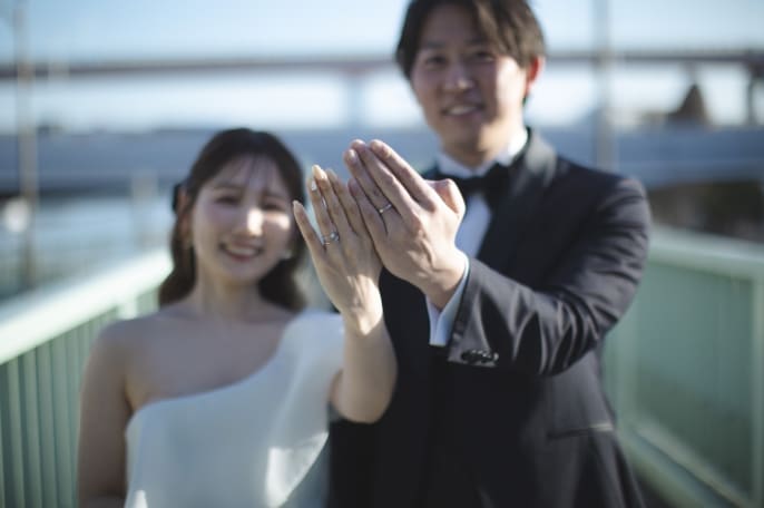 ピンク系で可愛らしく、ツヤ感を意識したメイクに晴れの日の夕日が当たってとてもきれいでした。髪飾りは大きめの黒リボンで大人かわいい印象に。できるだけ自然体なおふたりが撮れればと思い、楽しい撮影を心がけました。色や、光、影なども考慮しながらナチュラルに撮れたと思います。