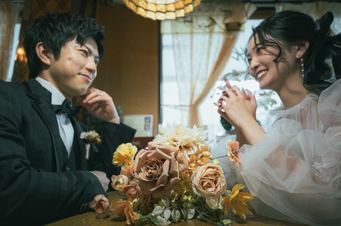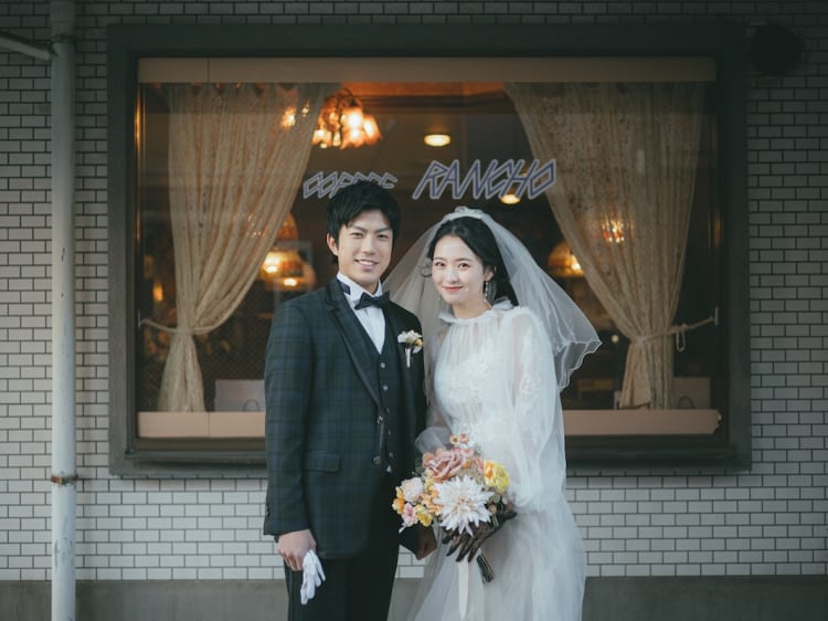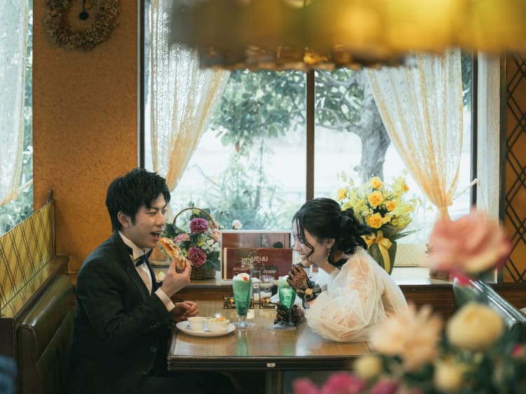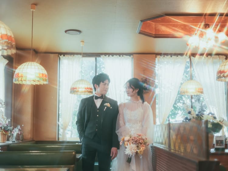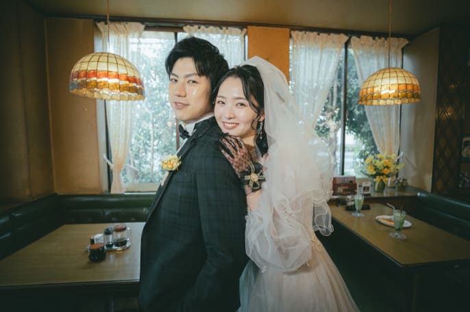 新婦様は「THEレトロな雰囲気」をご希望で、ご持参のパールのイヤリングとグローブに合わせて、高め位置のシニヨンヘアに黒リボンをご提案。喫茶店のすてきな空気感を活かせるよう、撮影では光の効果を利用するなど工夫しました。特別な場所で特別な一日をご一緒できたことは、私たちにとっても大切な思い出です。