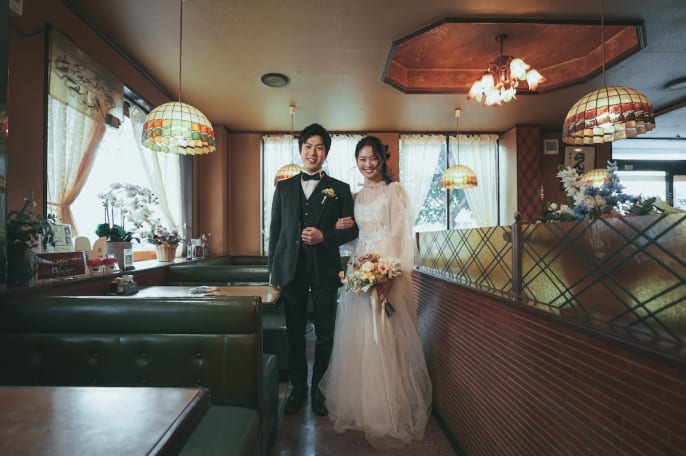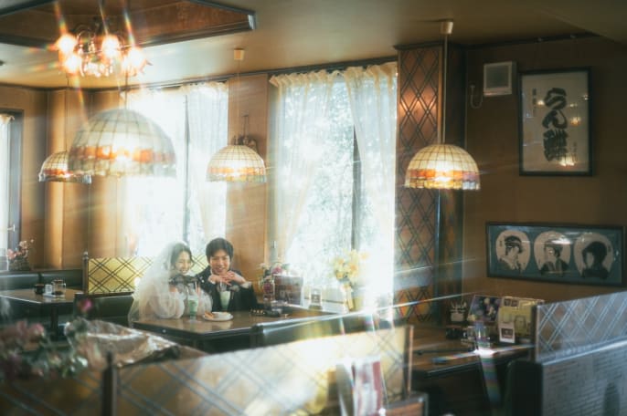 ふたりが学生の頃から通っていたという 思い出の喫茶店での撮影。