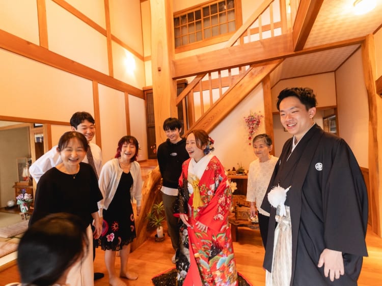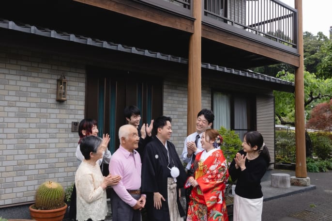 富士山本宮浅間大社で 撮影することにしたおふたり。 祖父母の家が近いとのことで、 せっかくならばとロケ撮影のあと そのまま祖父母の家へ立ち寄り、 晴れ姿をお披露目することに。