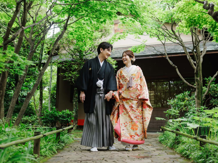 洋装はスタジオで 和装は風情のある東京・目白庭園で緑と スタジオで茶室フォトを 撮影することにしたおふたり。
