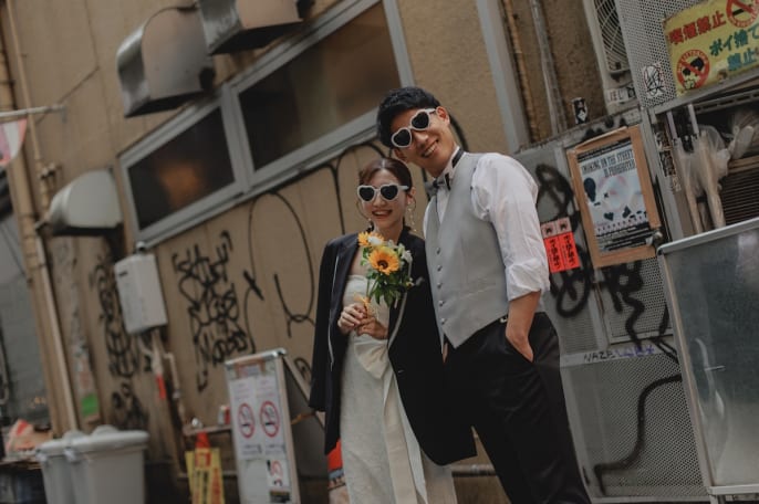 洋装は緑の中と街なか、 ふたりの希望がどちらも叶えられる 新宿周遊ロケーションに決定。 和装は屋内庭園スタジオで撮影することに。