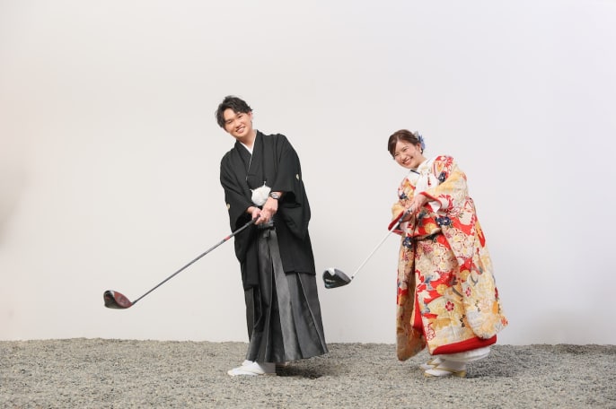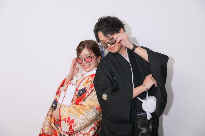 サウナグッズやサングラスなど、 趣味やお気に入りの小物を 撮影アイテムとして持参したおふたり。 和装とのギャップが印象的な撮影に。
